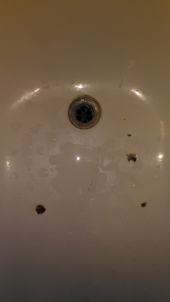 Je suis en présence d'une baignoire où l'émail est parti en plusieurs endroits laissant apparaître l'acier partiellement rouillé de la cuve.