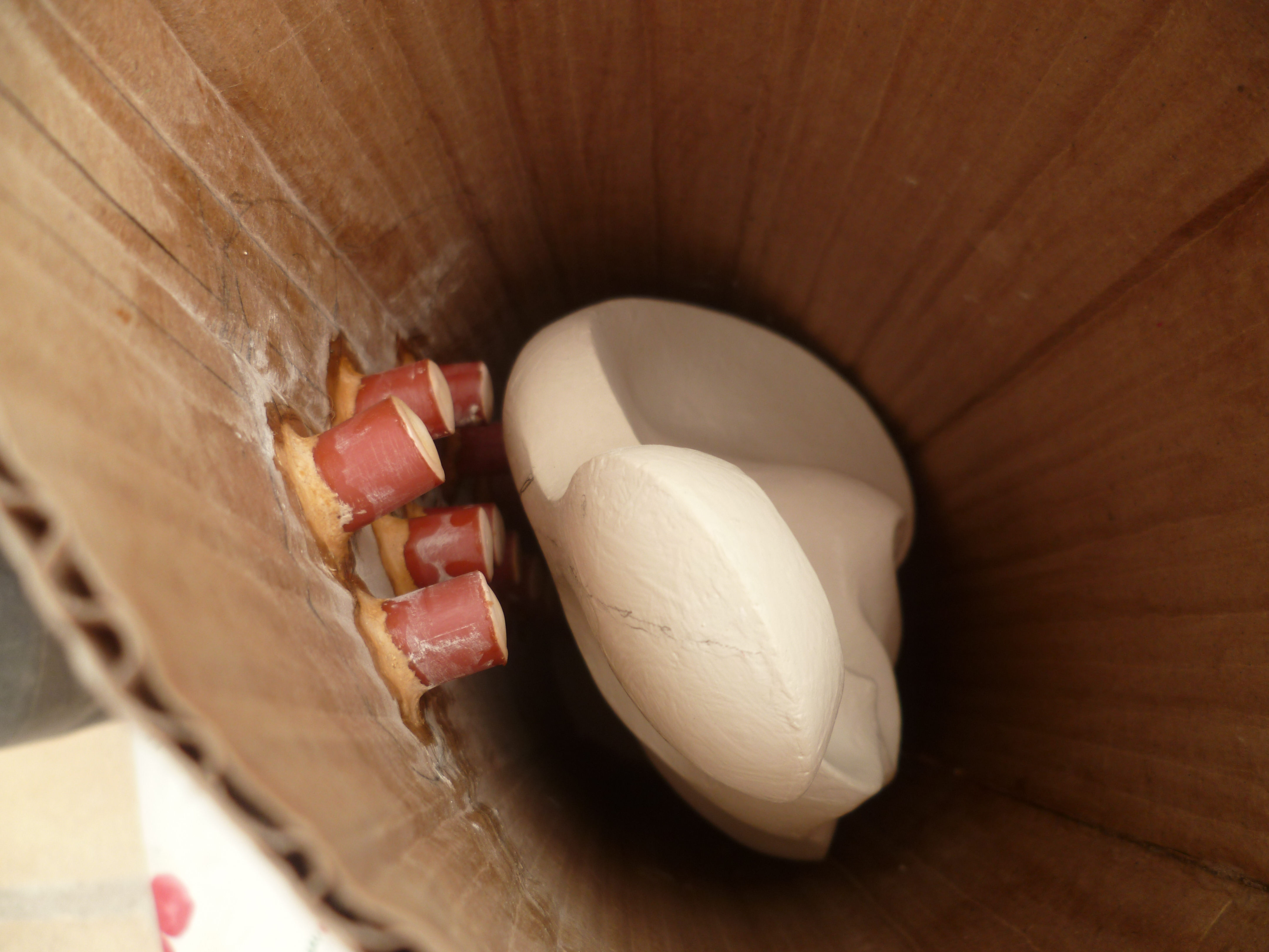 En fait, j' ai une duplication de cette sculpture en place à 80% pour un moulage en 2 parties et une autre en une seule ( bateau) entourée d' un carton rigide pour pouvoir recevoir le silicone . J' ai collé préalablement des tenons sur le carton en face du dos de cette sculpture. Entre eux est prévue la coupe . Après prise du RTV, je coulerai un plâtre autour afin de maintenir parfaitement l' ensemble et surtout d' avoir le relief des tenons qui s' emboîteront dans le silicone avant coulées dans ce moule ( plâtre) .