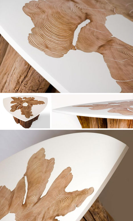 Le plateau serait en fait incorporé dans le tronc d'arbre, ce qui fait que sur le dessus de la table on verrai la coupe du tronc d'arbre et tout autour un plateau plus ou moins rectangulaire à angle arrondi (ou d'autre forme), d'environ 4 cm d'épaisseur ou un peu plus. Les trous, dans le bois (morceaux de bois endommagés), pourraient également être remplis de résine.