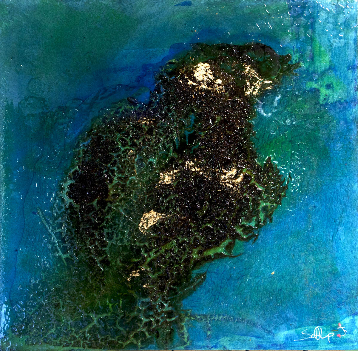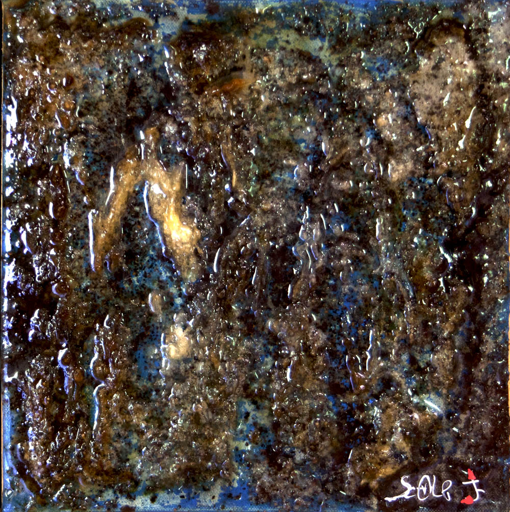 Toile lin ou Cotton, type de peinture acrylique, aucun collage, parfois j'insère dans l'acrylique des objets tel que des cailloux, des billes de verre, des feuilles d'or ou des petits ''dominos'' de bois peints a l'acrylique ou a la bombe.