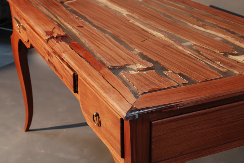 Je me questionnais sur les capacités de la résine polyester, en générale, à répondre à mes attentes. Et ayant déjà réalisé une pièce similaire, quoique incrusté de bois, je pensais pouvoir réitérer avec le même type de résine. Le bois doit alors un pouvoir structurant (logique) qui "tient" la résine en place.