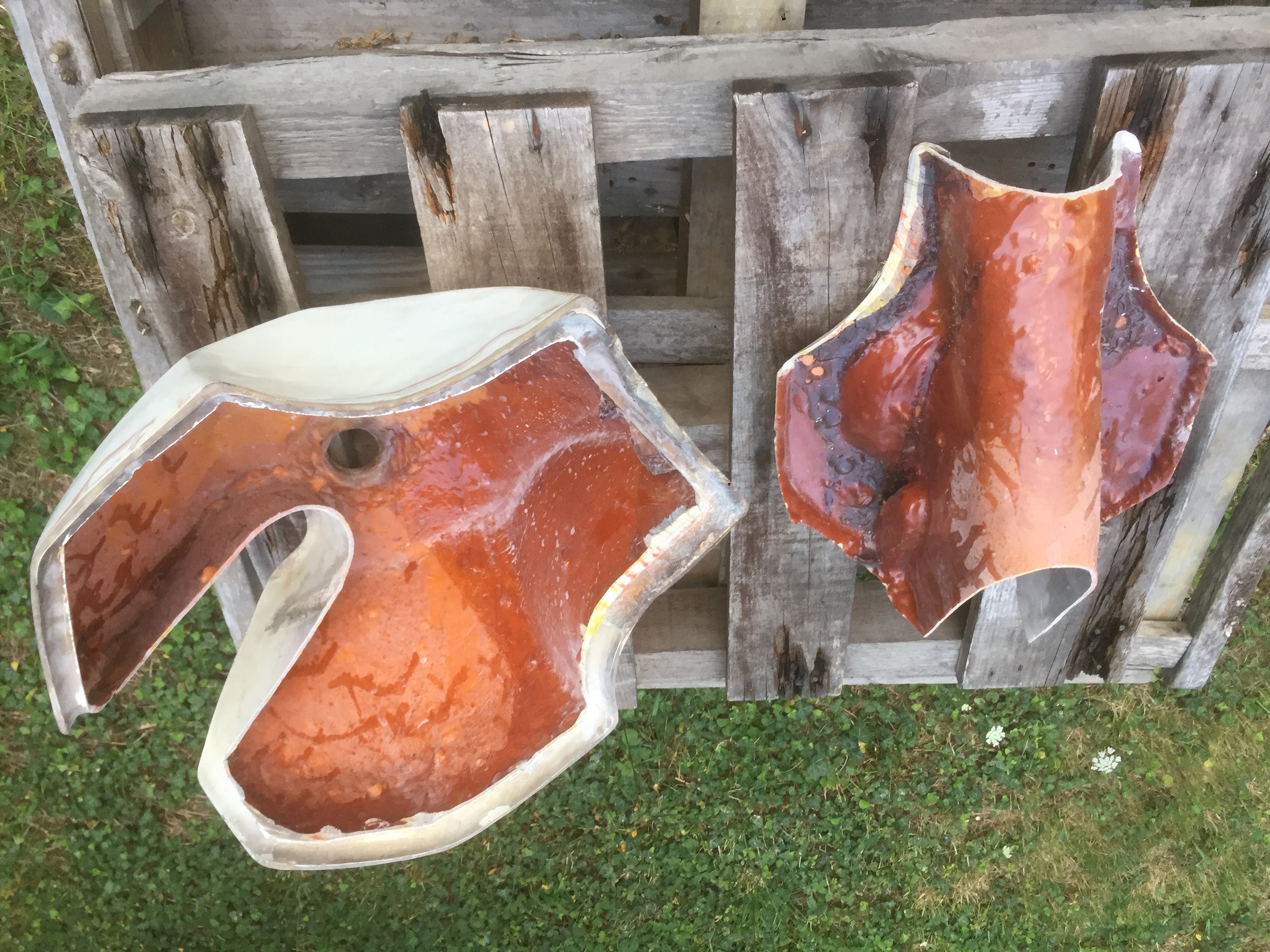 Je dirai que pour l'époque c'est du Polyester, mais pas la certitude. A l'odeur je ne sais pas reconnaitre. Sinon je vois très bien l'utilisation de mats de verre.