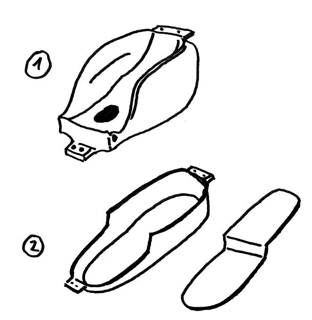 En 3 : le réservoir d'origine, toujours retourné, auquel j'appliquerai de la plastinile pour de chaque coté du tunnel afin que l'ensemble serve de moule au nouveau fond compatible au cadre de la moto et au nouveau réservoir.