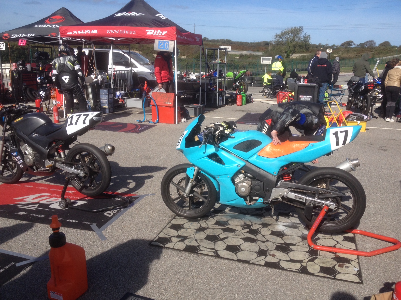 Oh !… dommage que ça ne soit pas l'idéal ; elle a fière allure en bleu et orange cette CBR. Un circuit normand humide… mince alors :P