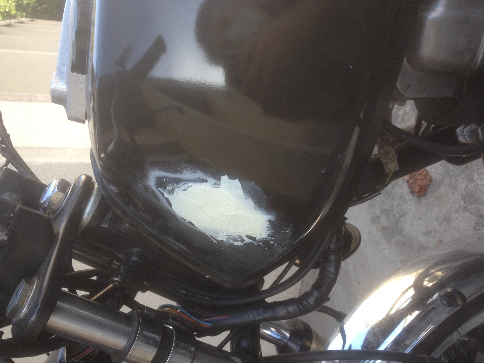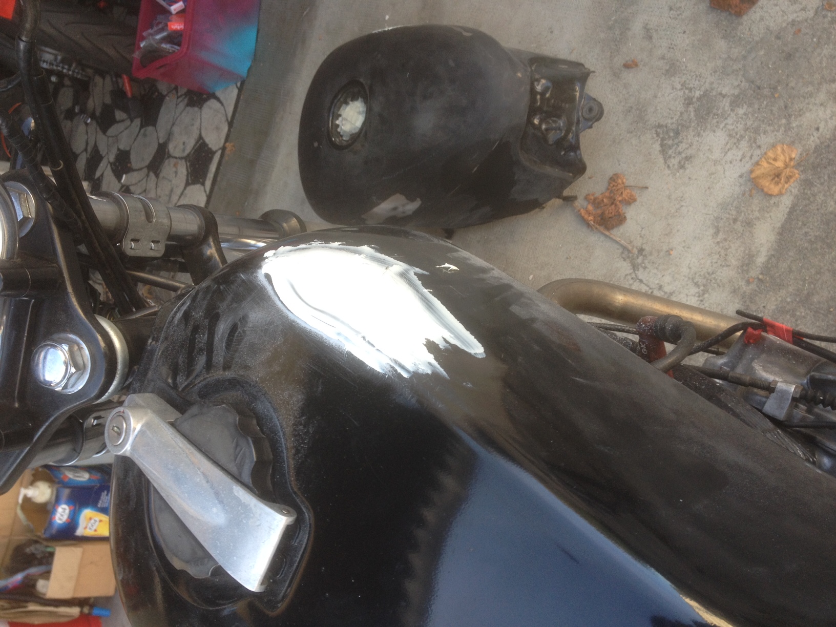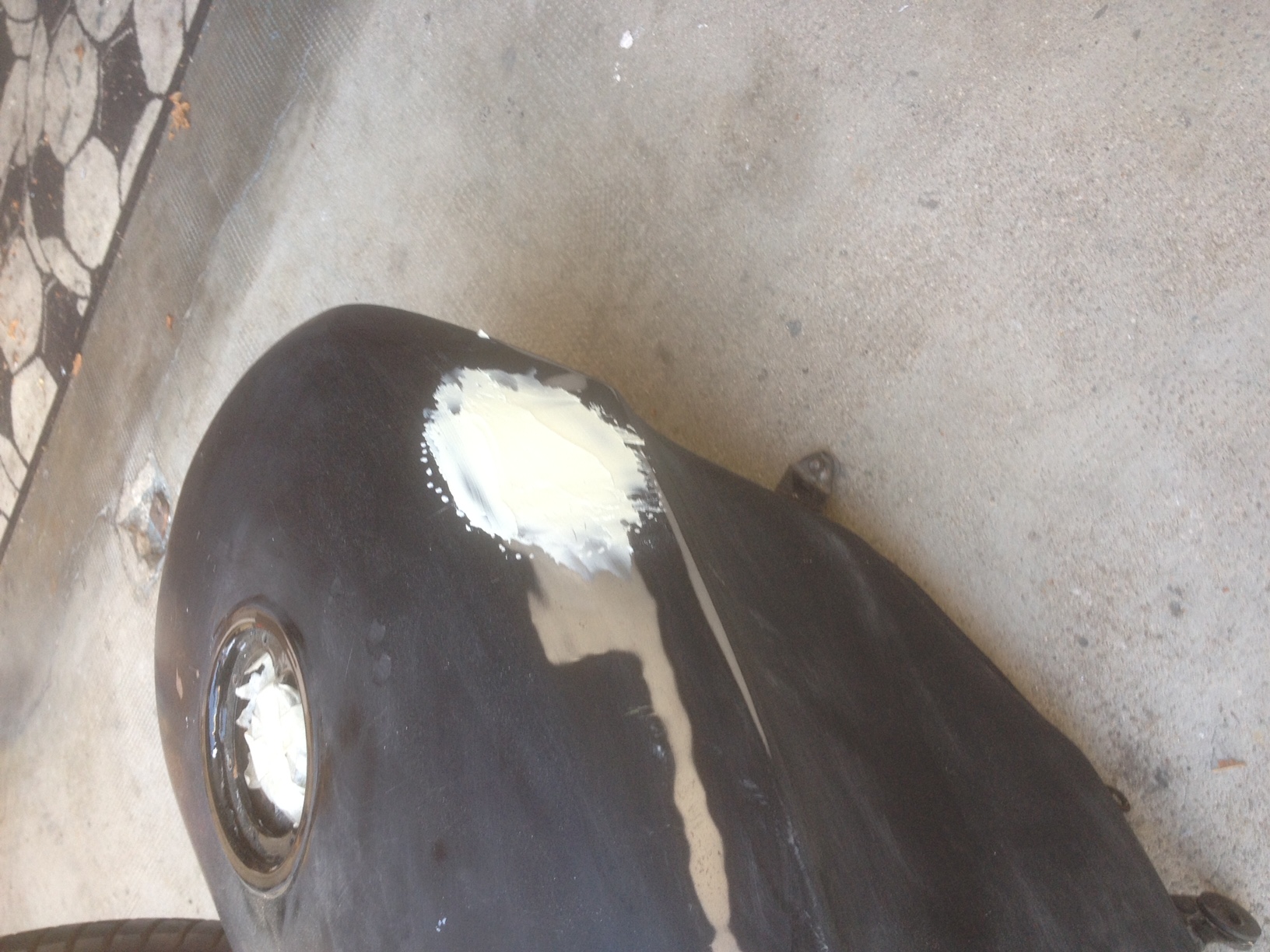 Pour réparer un poc sur un réservoir sans gaspiller du mastic et devoir poncer courageusement ensuite, vous faites un gabarit de l'autre côté du réservoir à l'endroit du poc ; vous appliquez à la spatule votre mastic sur le poc et vous donnez la forme avec votre gabarit, ça fait gagner du temps, des sous et de l'huile de coude.