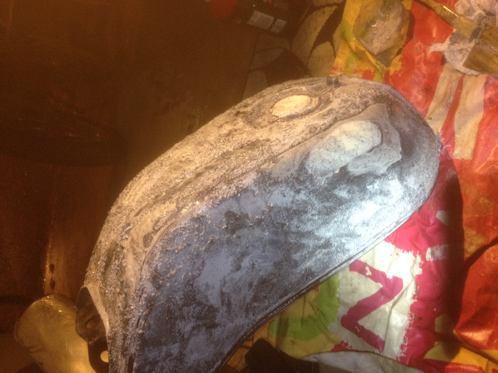 Bon, autrement j'ai besoin de vos conseils car je suis très embêté : je me suis rendu compte (en le ponçant, surprise :lol: ) que mon réservoir était perforé :x à plusieurs endroits, de petits trous d'un millimètre de diamètre. Pour l'instant j'ai trouvé 3 petits trous, mais je me rends compte que d'autres endroits sont touchés. L'intérieur du réservoir est un peu rouillé aussi, forcément...