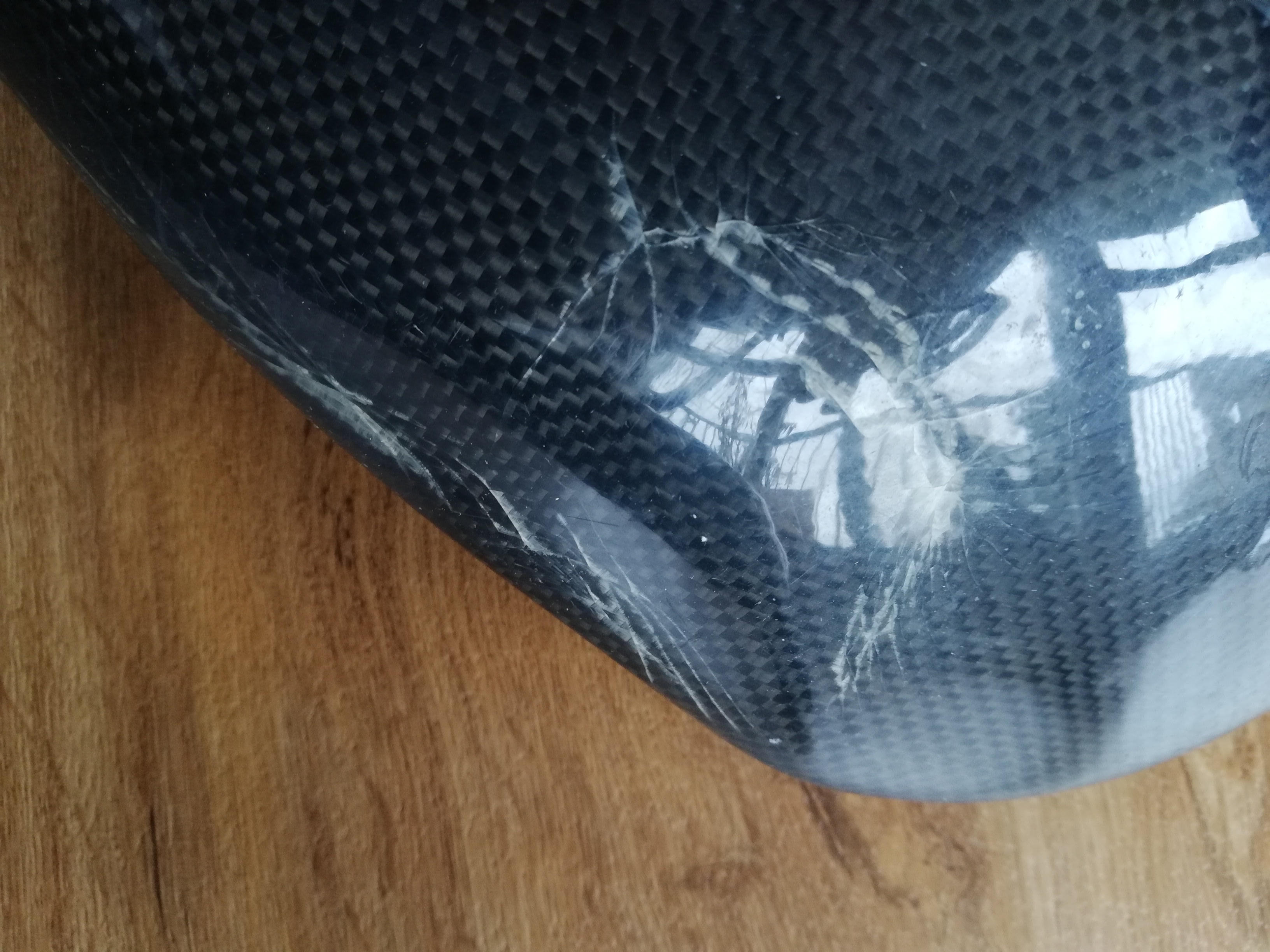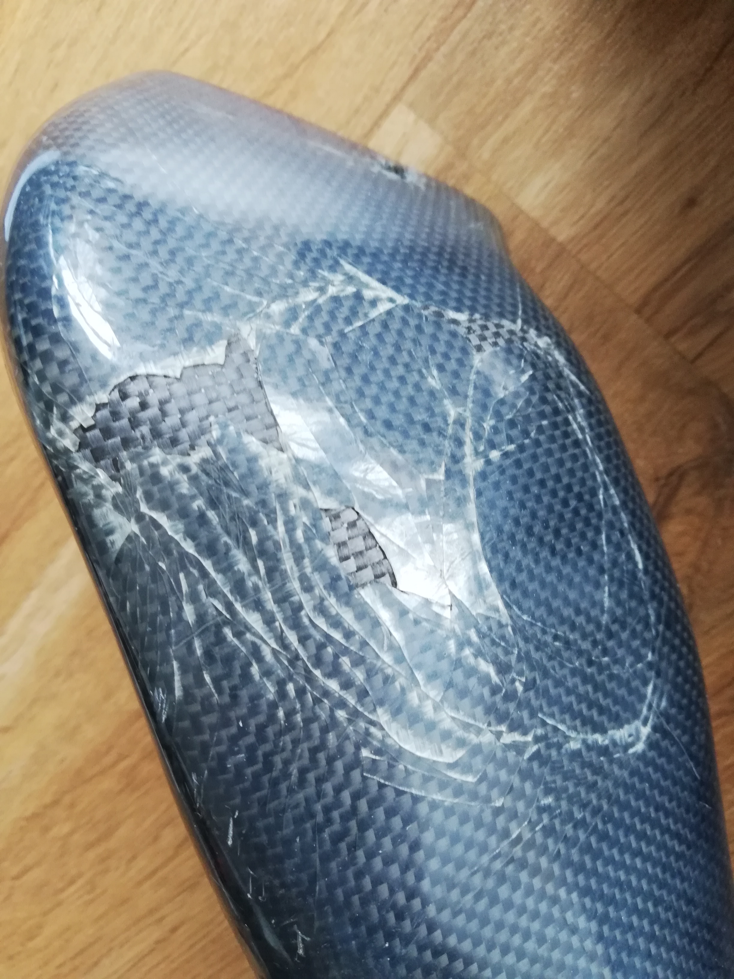 Du coup j'ai les pièces sous la main, elles sont en poly avec une couche carbone taffetas en finition + la protection qui a éclaté en plusieurs endroits lors d'impacts/chocs