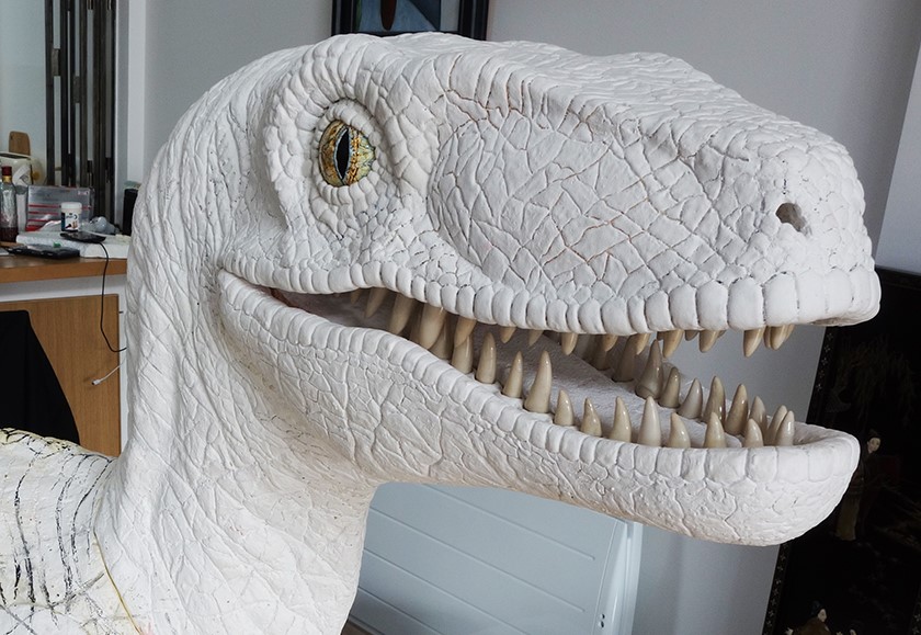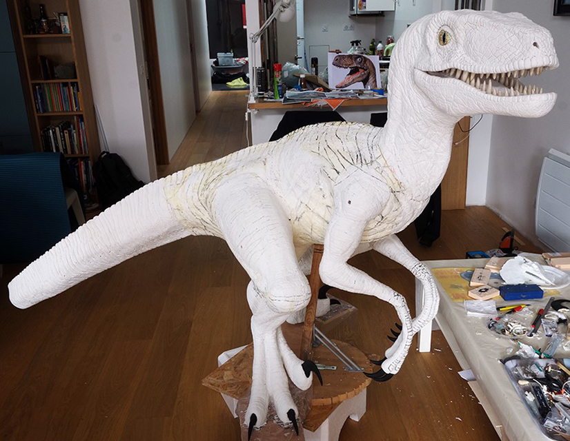 Bonjour à tous. Je me suis lancé dans la sculpture à l'échelle 1 d'un "vélociraptor" : squelette en tuyau PVC, corps en polystyrène et mousse expensive sculptées, et finition en enduit à placo.