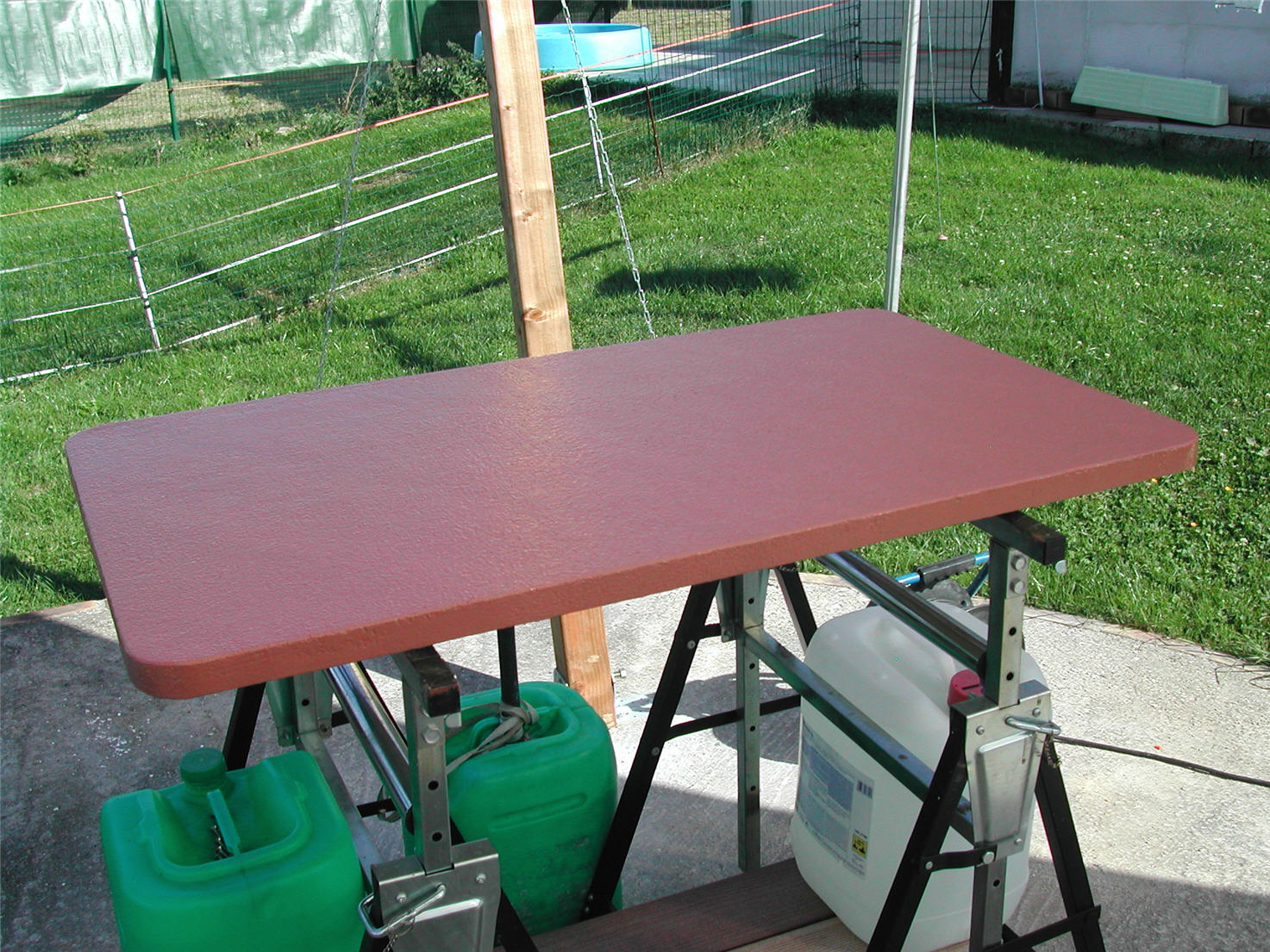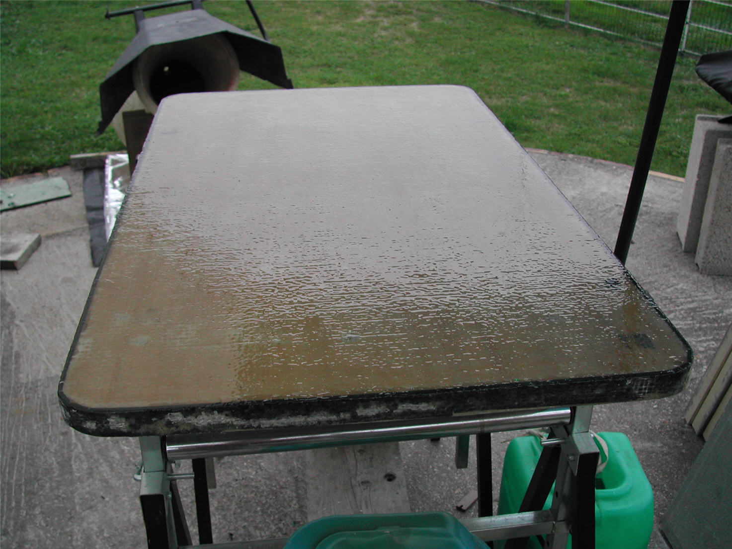 - vous reprenez votre plaque en la ponçant bien lisse seulement sur le dessus, vous la cirez et vous tirez dessus une plaque entièrement composite qui ne subira plus les aléas climatiques. Mat 300, résine iso et finition comme indiqué dans la première solution.