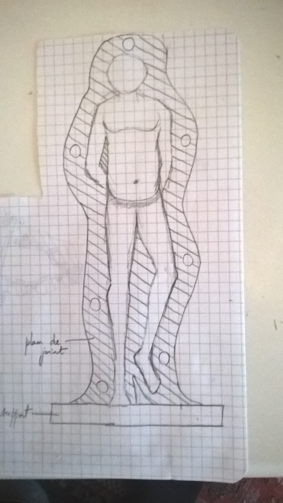 Le plan de joint ne se trouvera pas que sur un plan (en terme de géométrie dans l'espace) puisque les jambes ne se trouvent pas sur le même plan, les bras et le buste non plus. Mais je pense que ce n'est pas grave.