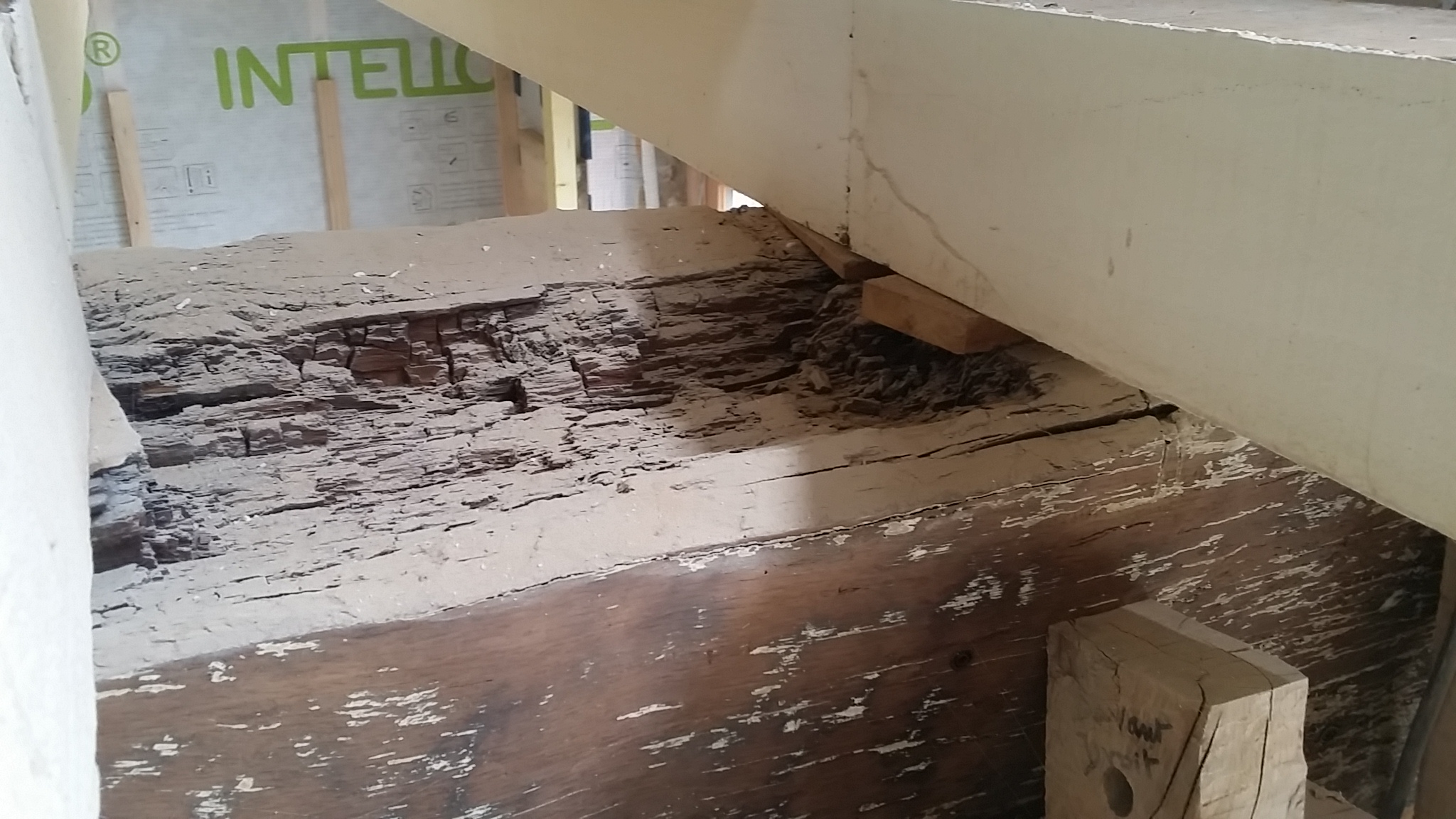 Comme dans beaucoup d'anciennes maisons, le bois porteur s'étant dégradé au fil des années, des cales ont été positionnées sous les solives pour maintenir leur niveau, de manière très irrégulière d'ailleurs.
