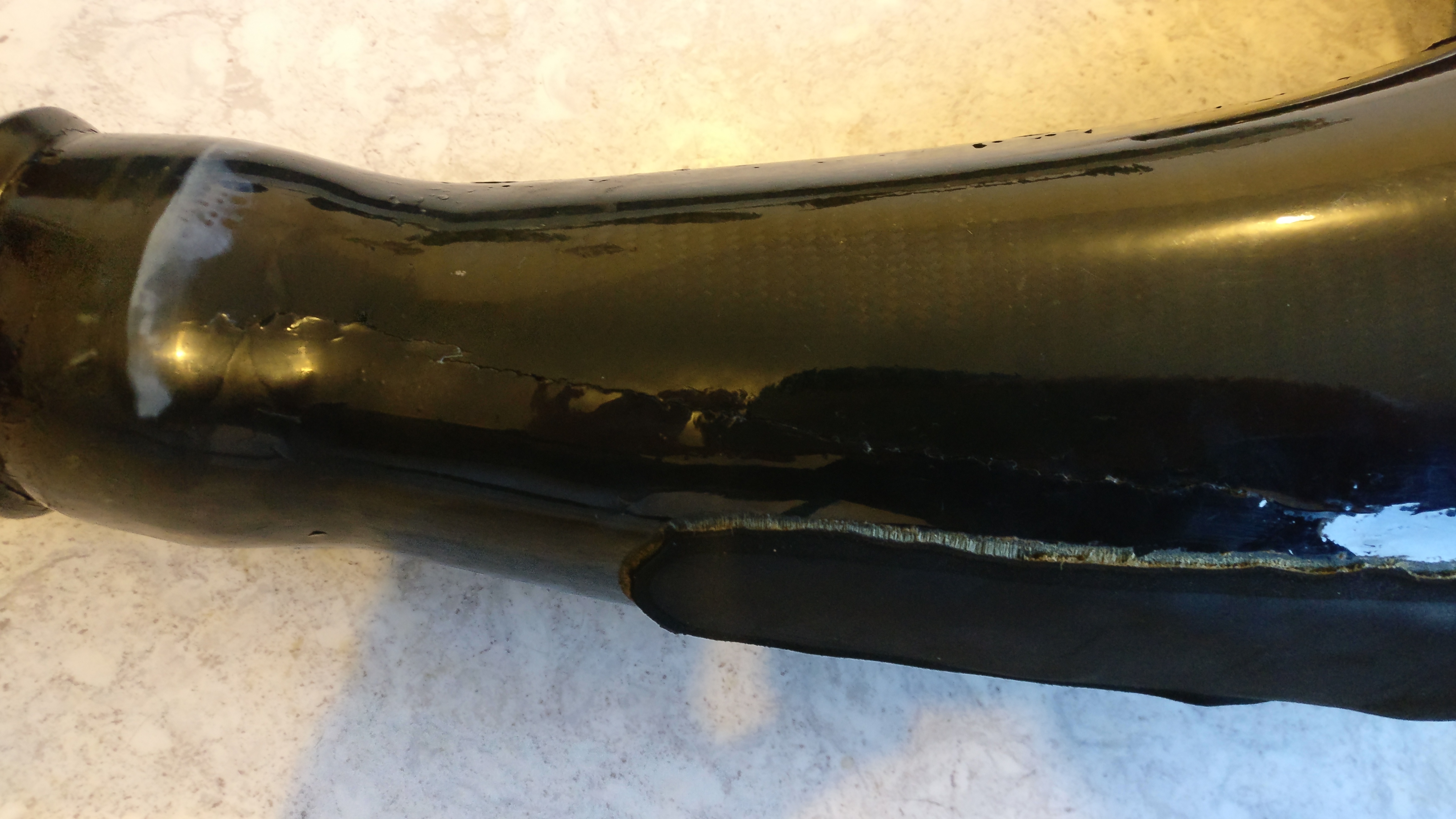 Réparer correctement et efficacement consisterait à couper le pot, le réparer à l'intérieur avec une nouvelle stratification de carbone puis le ressouder par l'extérieur, le tout après avoir soigneusement poncé-dépoussiéré-nettoyé.