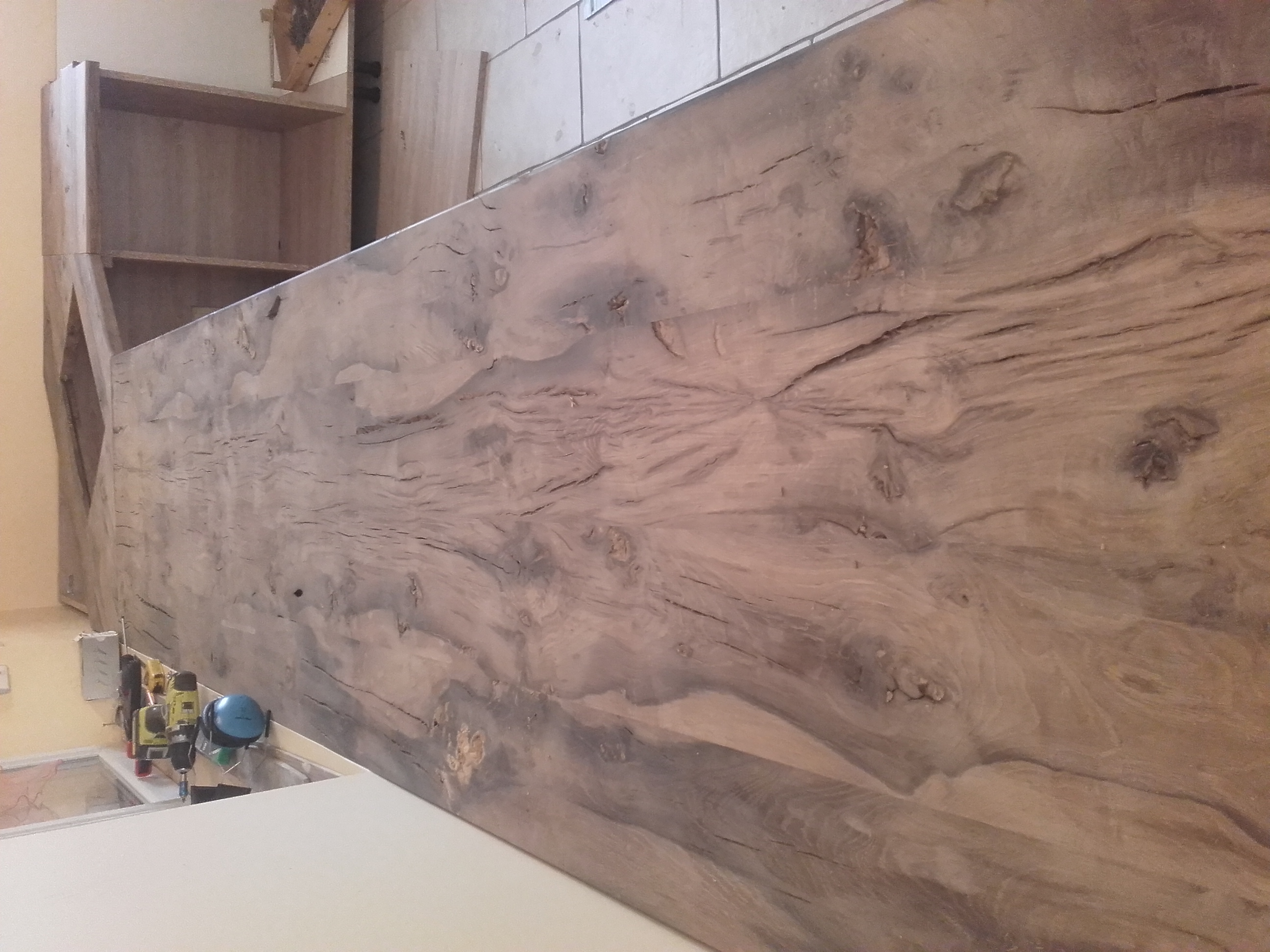 je souhaite installer ce plan de travail (en photo)dans une cuisine que j'ai créer avec du bois vieux. je souhaite garder l'authenticité de ce bois tout en "bouchant" toute les aspérité et trous car il ne sera pas possible de le nettoyer au chiffon ou à l'éponge.