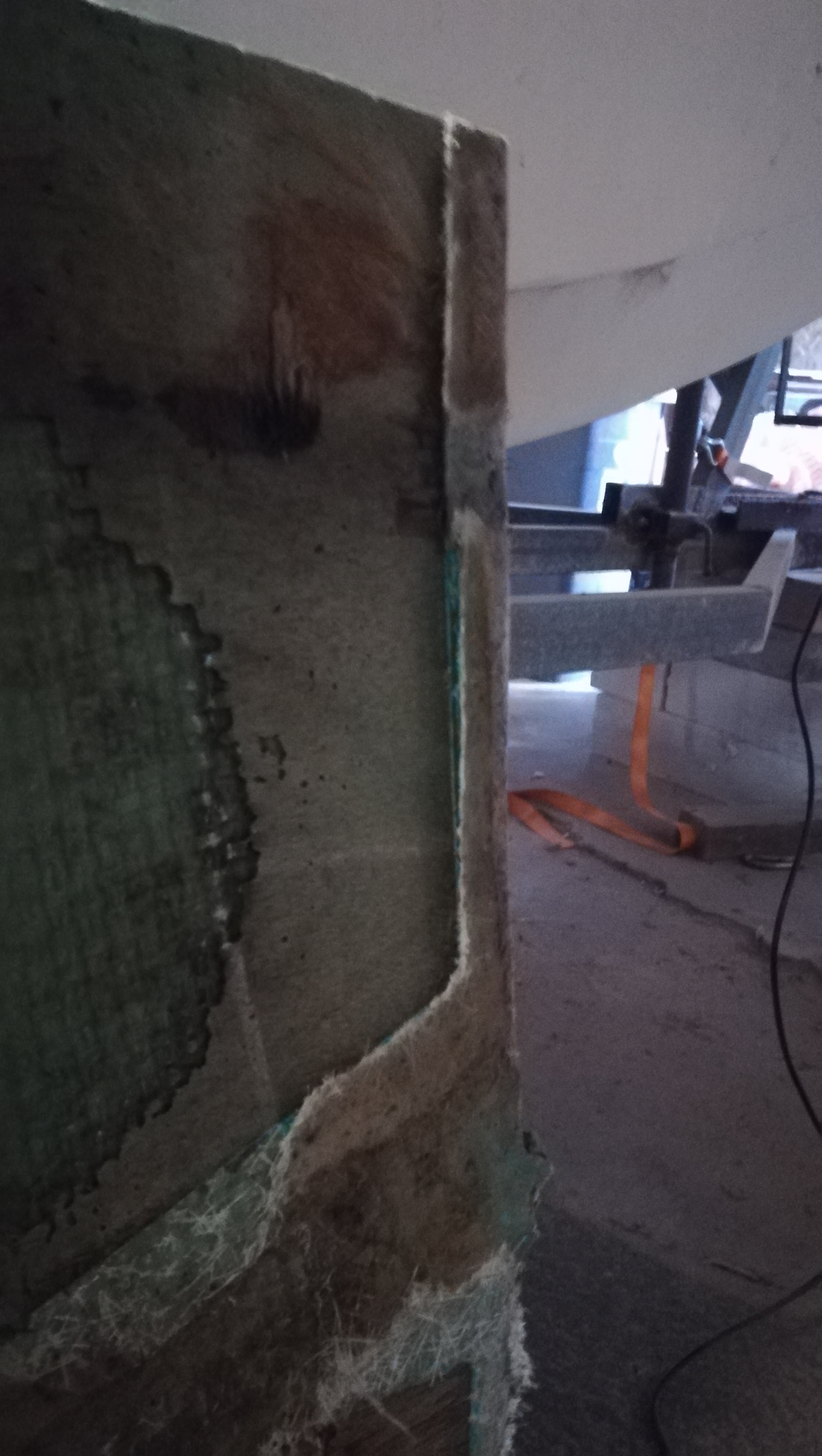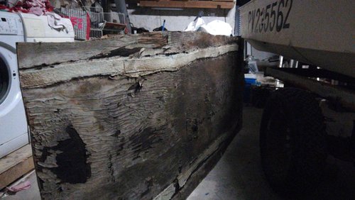 Il va falloir le renforcer par l'intérieur mais pas avec un bois qui prendra le même chemin que le précédent. Il faut poncer toutes les aspérités les décollements, etc. pour avoir une surface propre et nette, la dépoussiérer et passer un chiffon non pelucheux avec de l'acétone juste avant de commencer à stratifier :