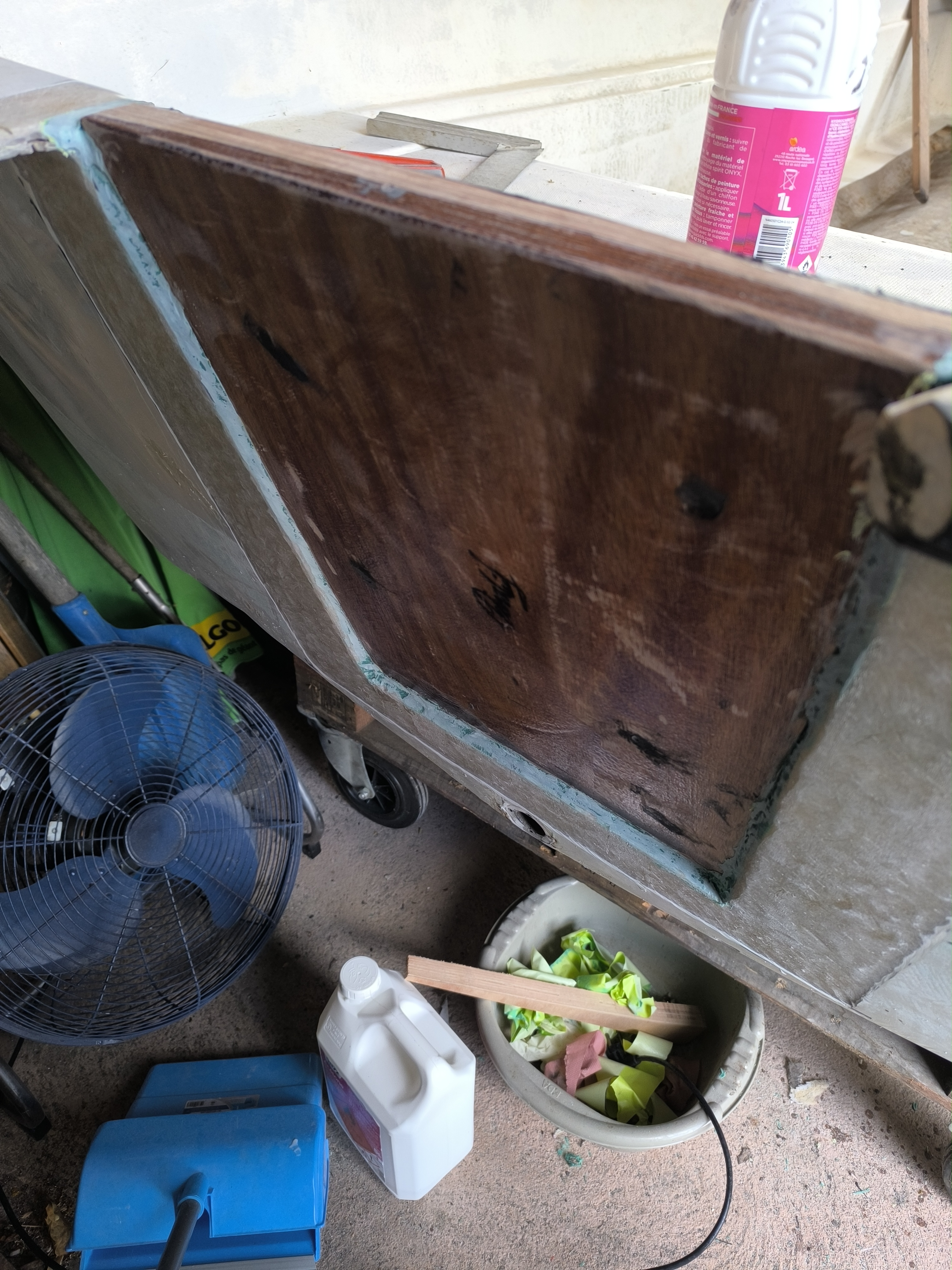 Une question je dois stratifié le tableau arrière qui va supporter un 30cv pas plus , comme l'autre mat roving mat mais là le bois effleure en haut la fibre mis a nu mais en bas il y a au moins 6mm ,7mm a rattraper, j'ai mis du mastic fibré pour un joint en pente douce pour debuller facilement mais mon idée est de rajouter une épaisseur de 450 au gabarit du bois pour rattraper la différence ; interposé entre la pose du mat et du roving qui iront s'accrocher elles sur la fibre mis à nu que d'ailleurs que je vais agrandir car là il n'y a que 10 cms (photos)