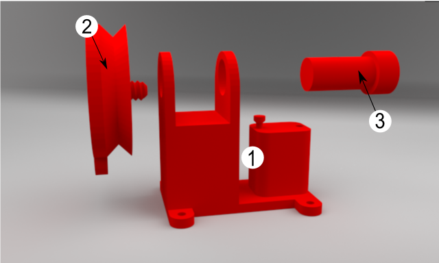 Il est à noter que la pièce 2 est sensée comporter un pas de vis (non représenté ici) et que la pièce 3 est sensée être taraudée, les deux pièces se vissant l'une dans l'autre. La troisième enfin, montre que la pièce 2 peut être remplacée par une poulie (ou une roue dentée) vissable sur l'axe 3