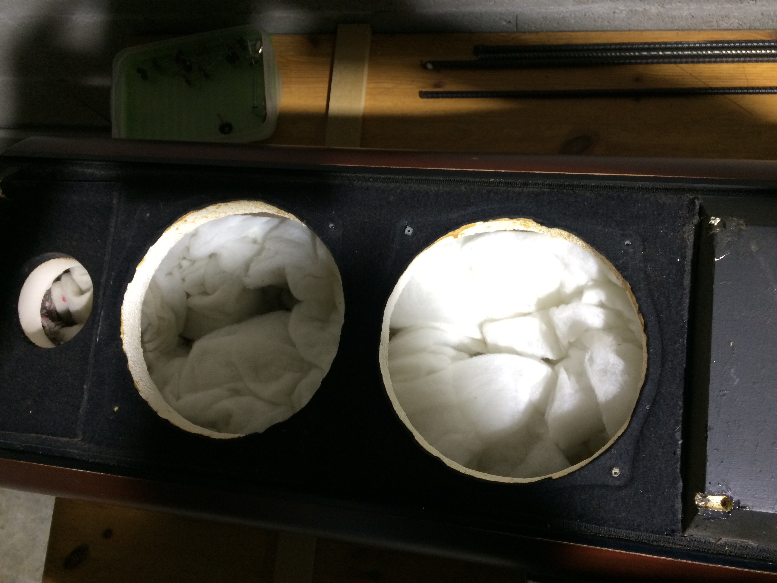Tout d'abord je tiens à vous préciser que la phase de renfort des fissures c'est déroulée correctement malgré un gros souci sur une des enceintes qui c'est brisée lors des manipulations. Maintenant tout est recollé et renforcé mais je bute sur la finition extérieure. Au départ je souhaitai refaire un placage bois 6/10 comme le modèle original mais plusieurs tentatives de placage non concluante m'incite à abandonner cette solution.