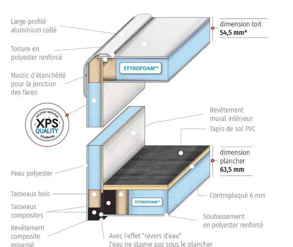 Sur le schéma en coupe de la construction, il n'est pas dit que la couche de stratifié du toit est collée à la mousse polystyrène par une colle appropriée donc il me semble que le stratifié polyester est bien léger et qu'il se gondole tout seul puisque rien ne le retient.