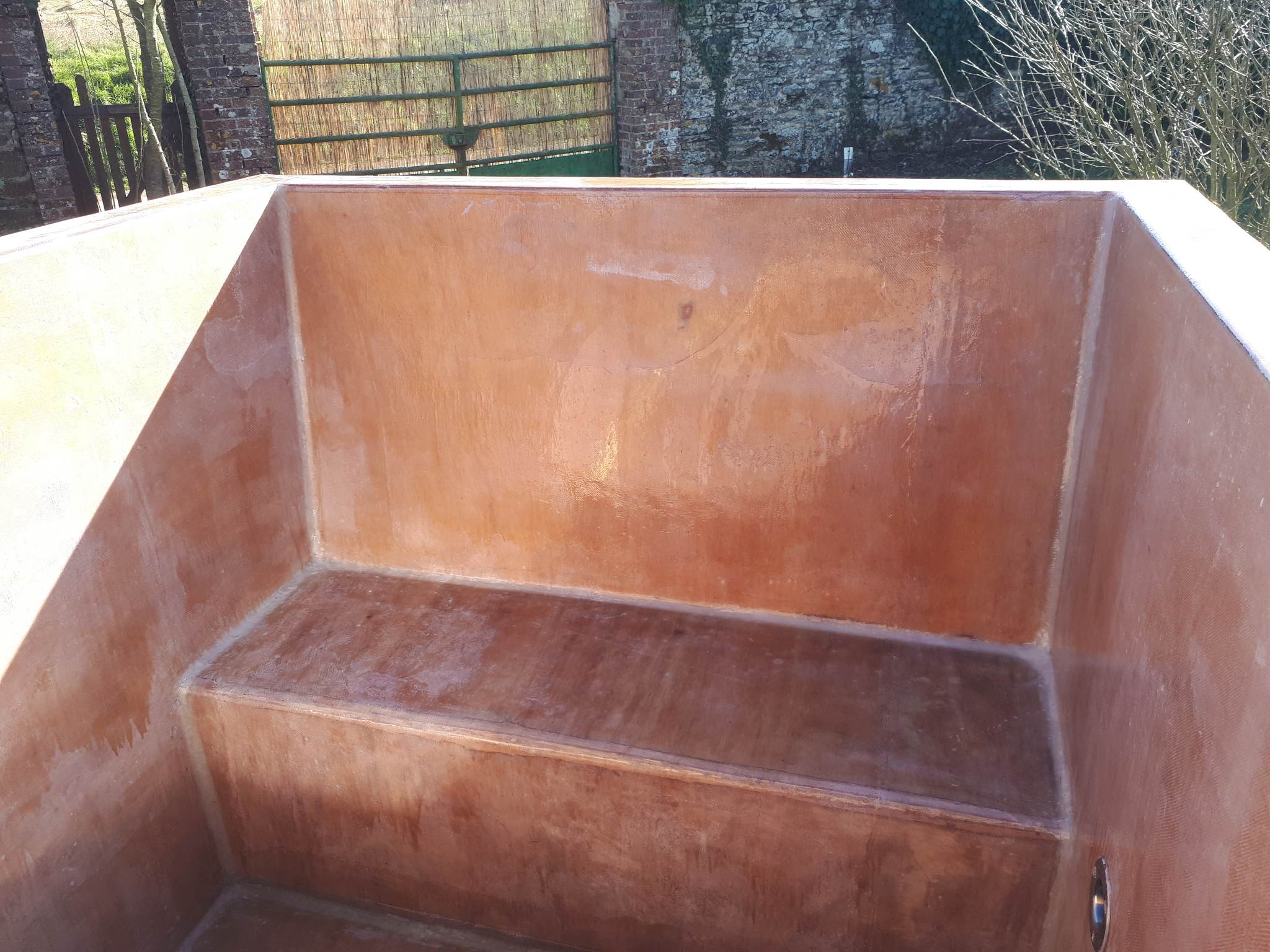 Il serait judicieux de coucher le bassin selon les parois que vous traitez pour être toujours à l'horizontale car j'ai remarqué des traces de coulure sur une photo. Les résines époxy ne sont pas thixotropes aussi ça dégouline ; pour les endroits où la fibre se sent au toucher, il est possible que la résine ait un peu glissé au moment de la stratification, l'usure a fait le reste.