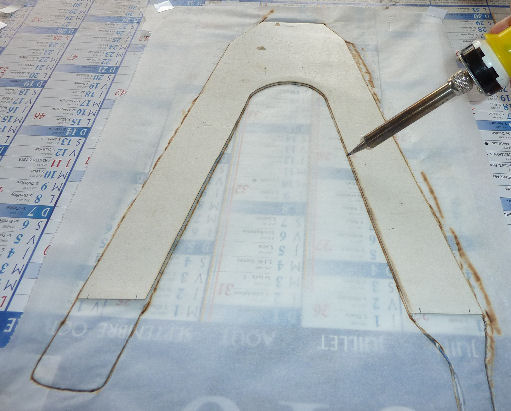 A l’aide d’un patron en carton à la forme de ma pièce, je découpe ma baudruche au fer à souder dans le film alimentaire en plaçant une feuille de papier à cuisson entre le fer et le film (cf photos).
