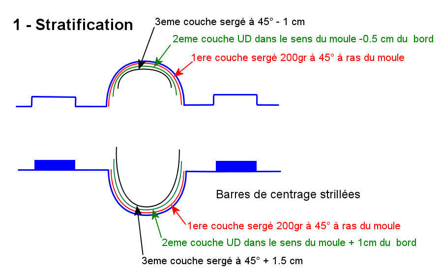 Lors de la stratification des deux demi-moules, je laisse dépasser du tissu sur un des moules pour faire la liaison avec le second.