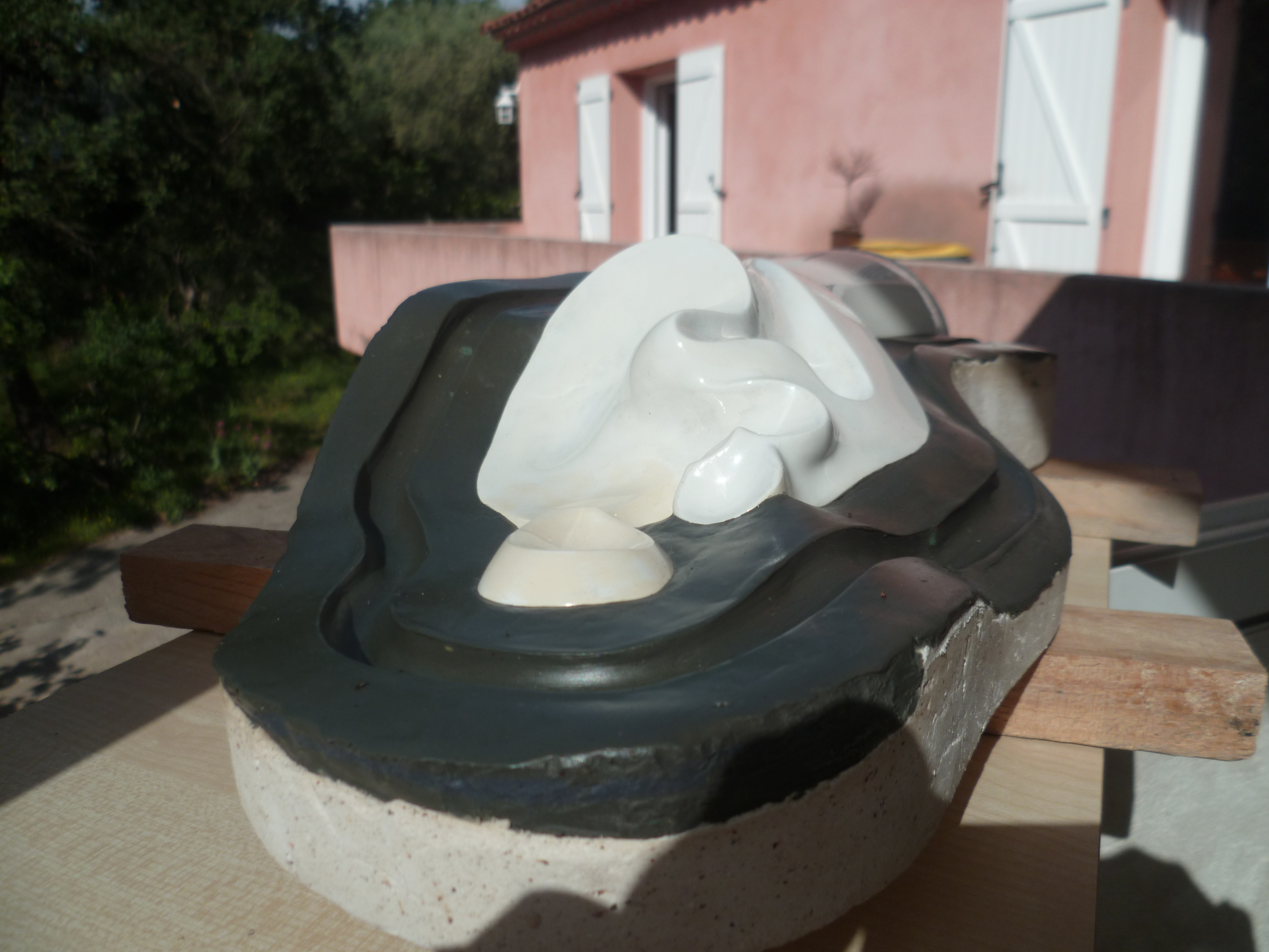 Voilà déjà 2 images de mon moulage en 2 parties. Resterait donc des tenons à insérer, à faire un bourrelet en périphérie et à entourer l' ensemble avec un carton rigide mais bon, vous pouvez voir cette inclinaison...