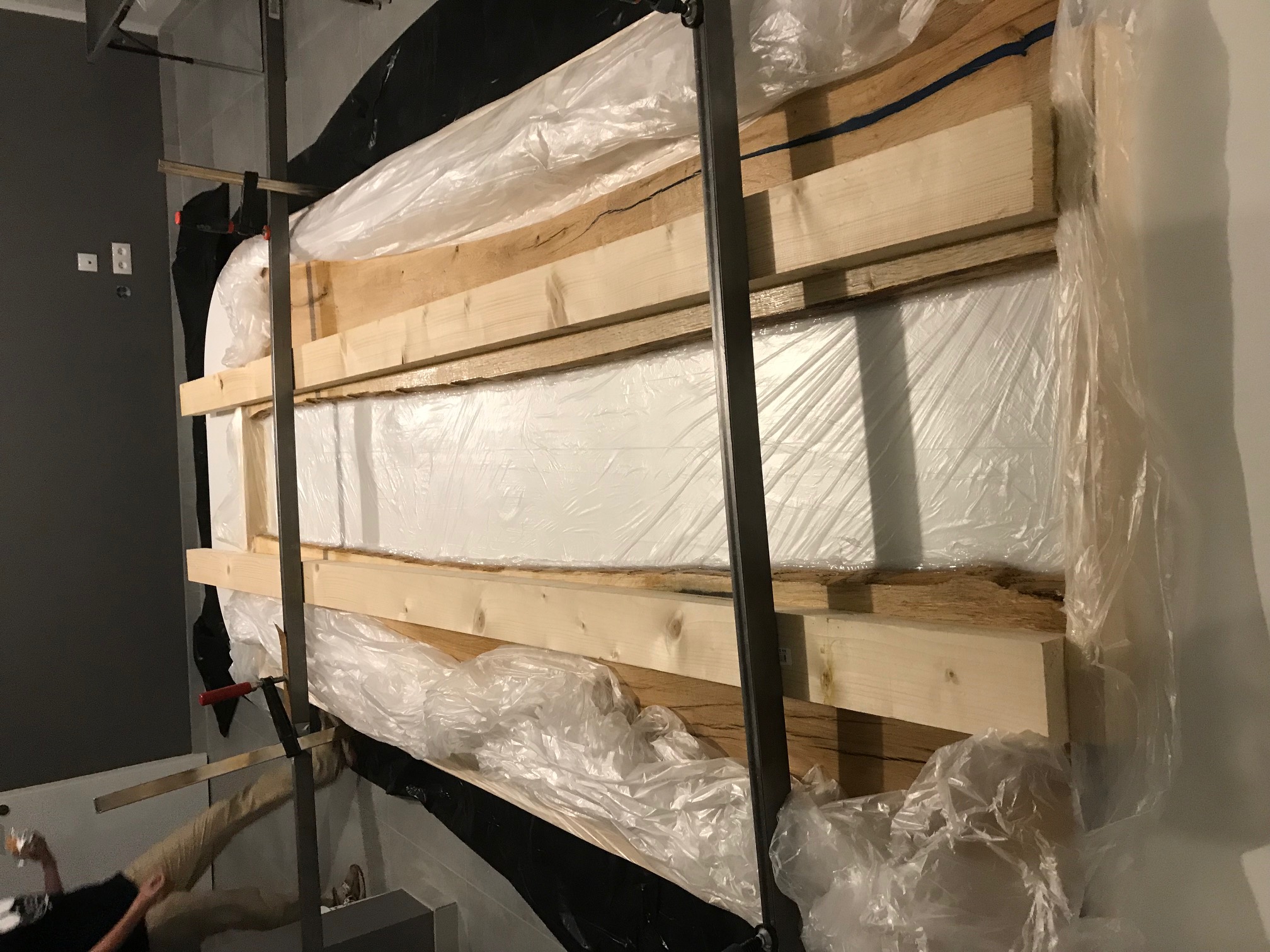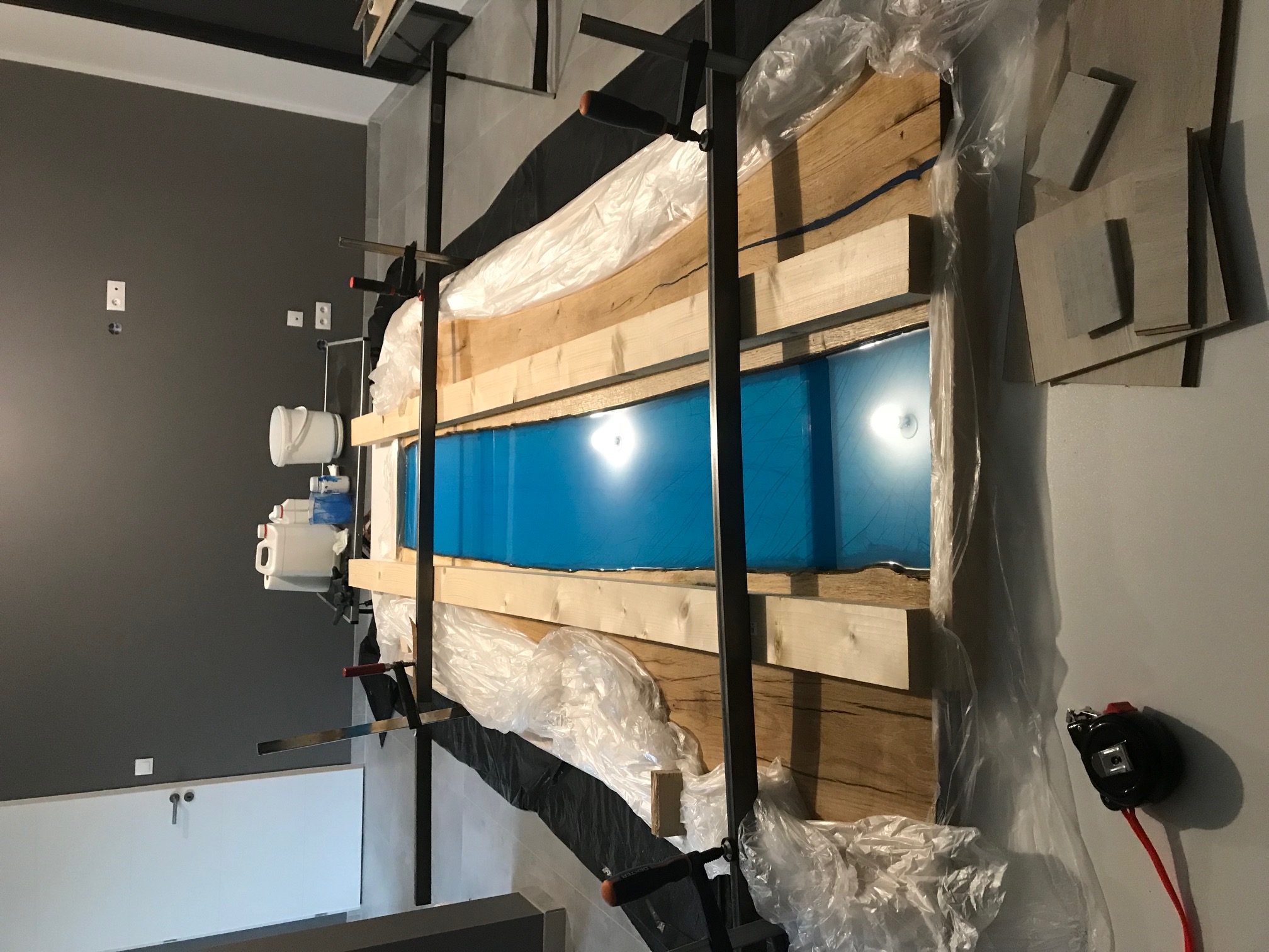 Ensuite j'ai préparé mon coffrage avec une bâche en polyéthylène plutôt que le Tercanol simplement parce que je réalise cette coulée dans une maison neuve et que j'ai pas envie mais alors pas du tout que l'époxy coule partout si j'ai mal fait l'étanchéité. Du coup avec une bâche que je fais revenir sur le dessus y'a pas de risque. Puis j'ai mis du silicone à la jointure planche / bâche pour éviter que la résine passe dessous (en priant matin et soir que le silicone accroche suffisamment sur la bâche pour bloquer la résine) :