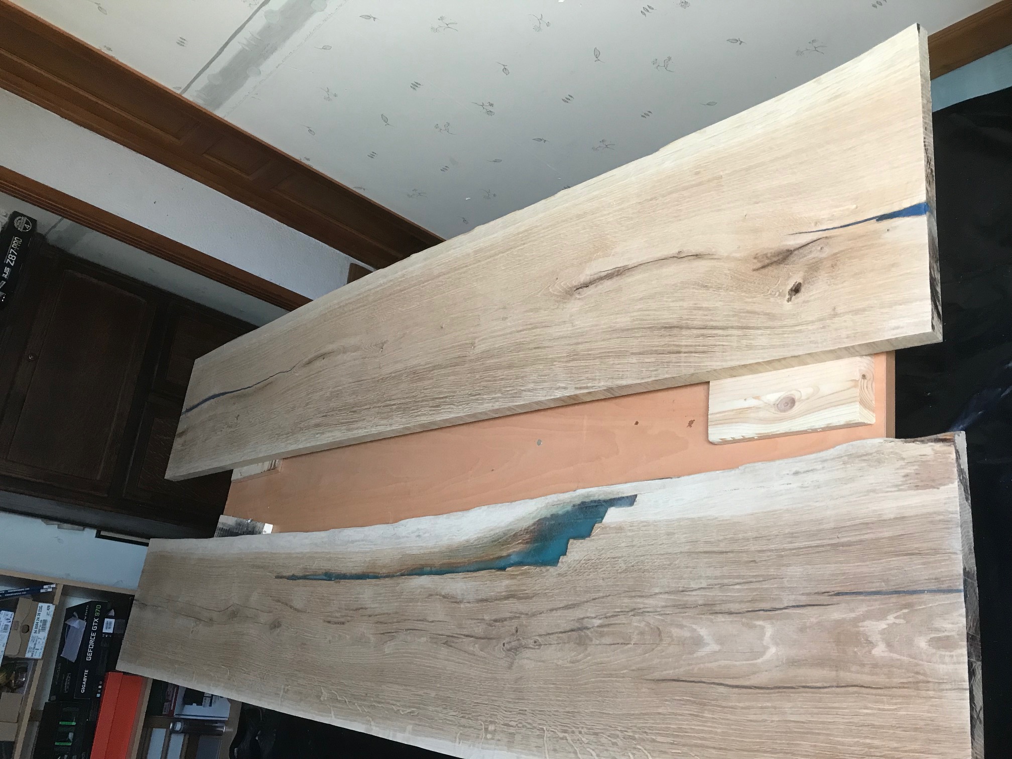 Le projet avance, j'ai mis la main sur deux nouvelles planches que j'ai passé à la dégauchisseuse dans une scierie, je les ai travaillée un peu et j'ai mis de la résine avec des pigments phosphorescents là où ça en avait besoin (fentes, trou...):