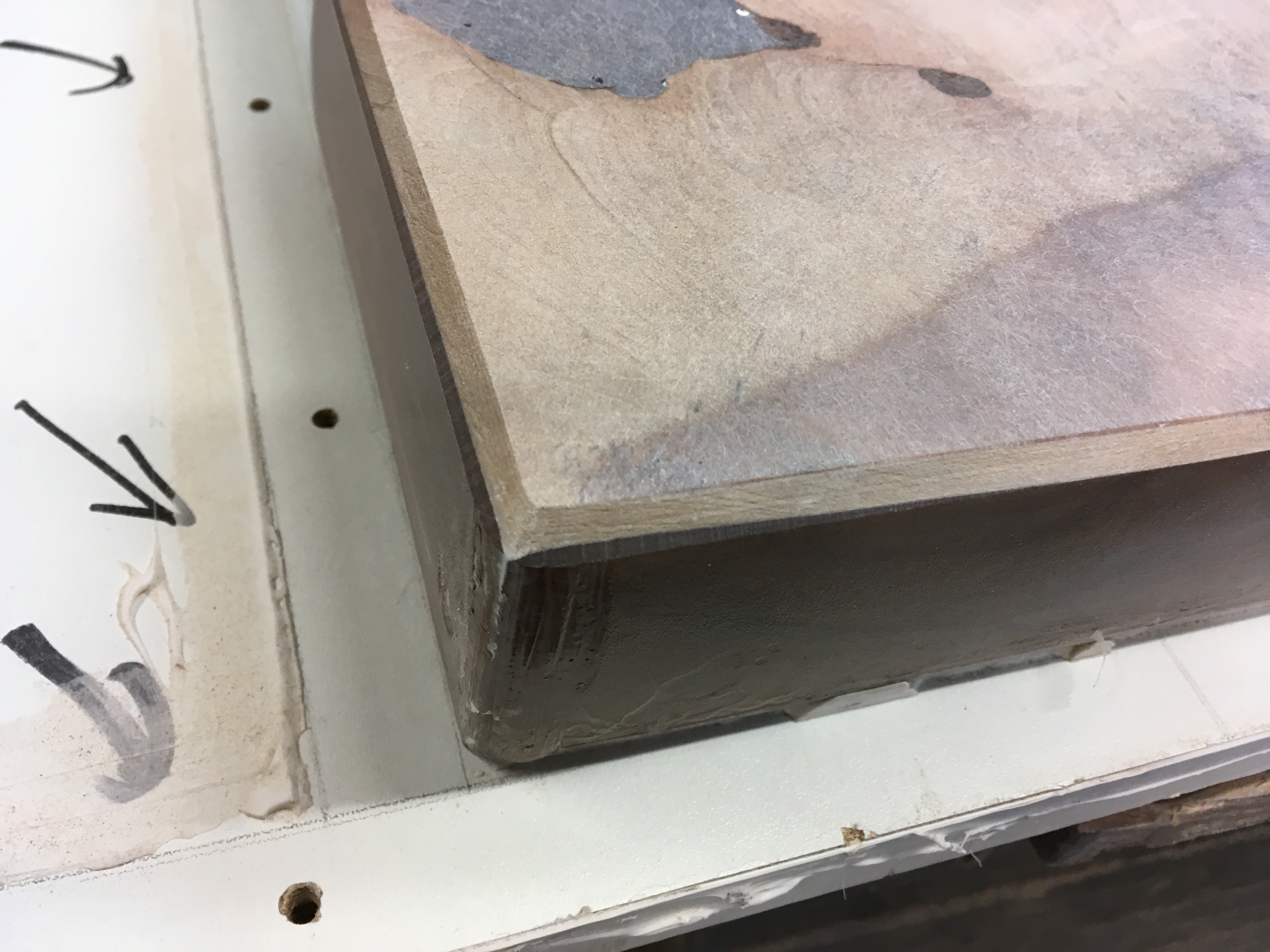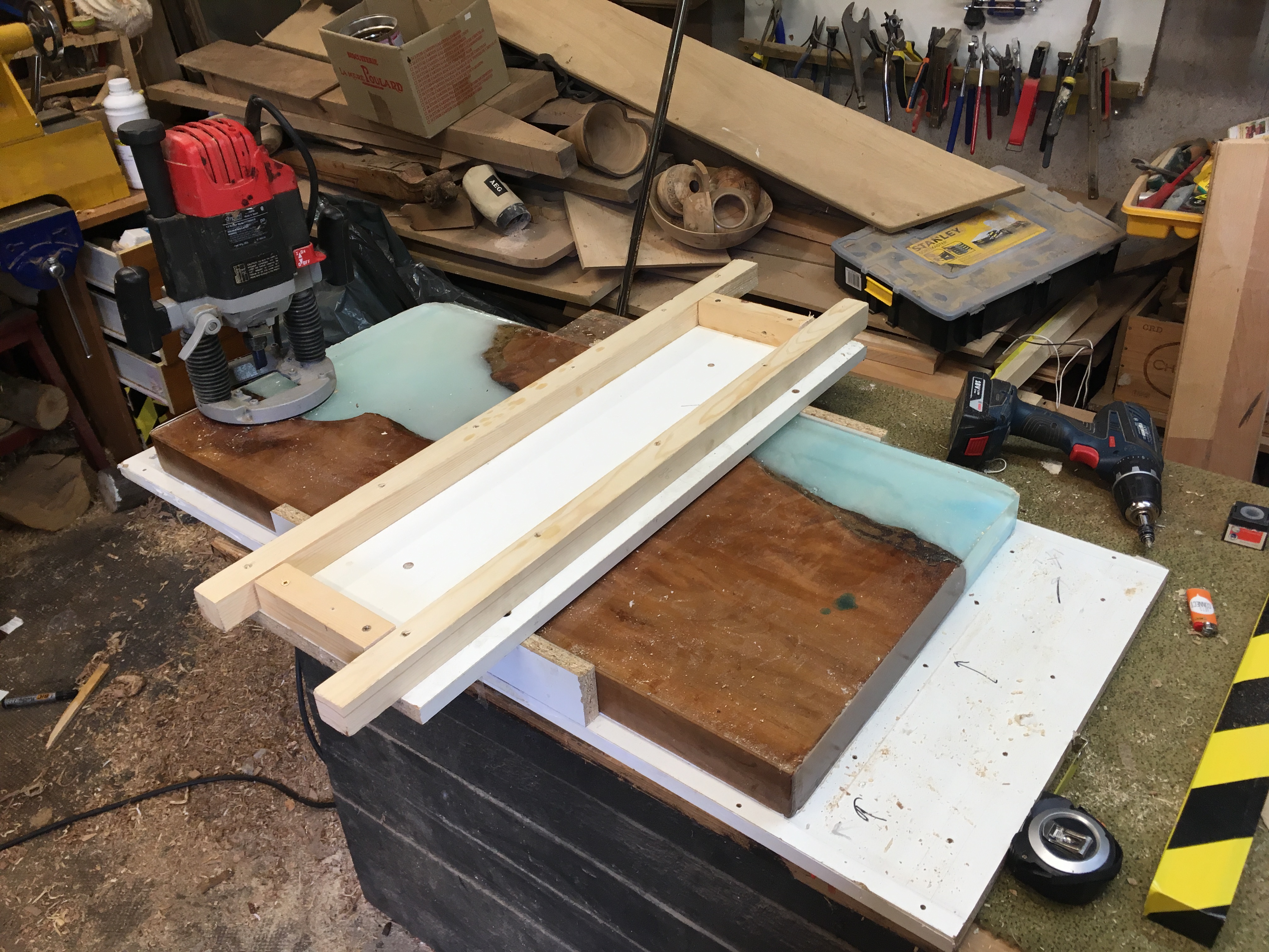 pas grave, je vais aplanir a la défonceuse et faire des bords en chanfrein, ca va equilibrer tout ca. je vais voir comment réagit l'epoxy au travail de la defonceuse... surprise...