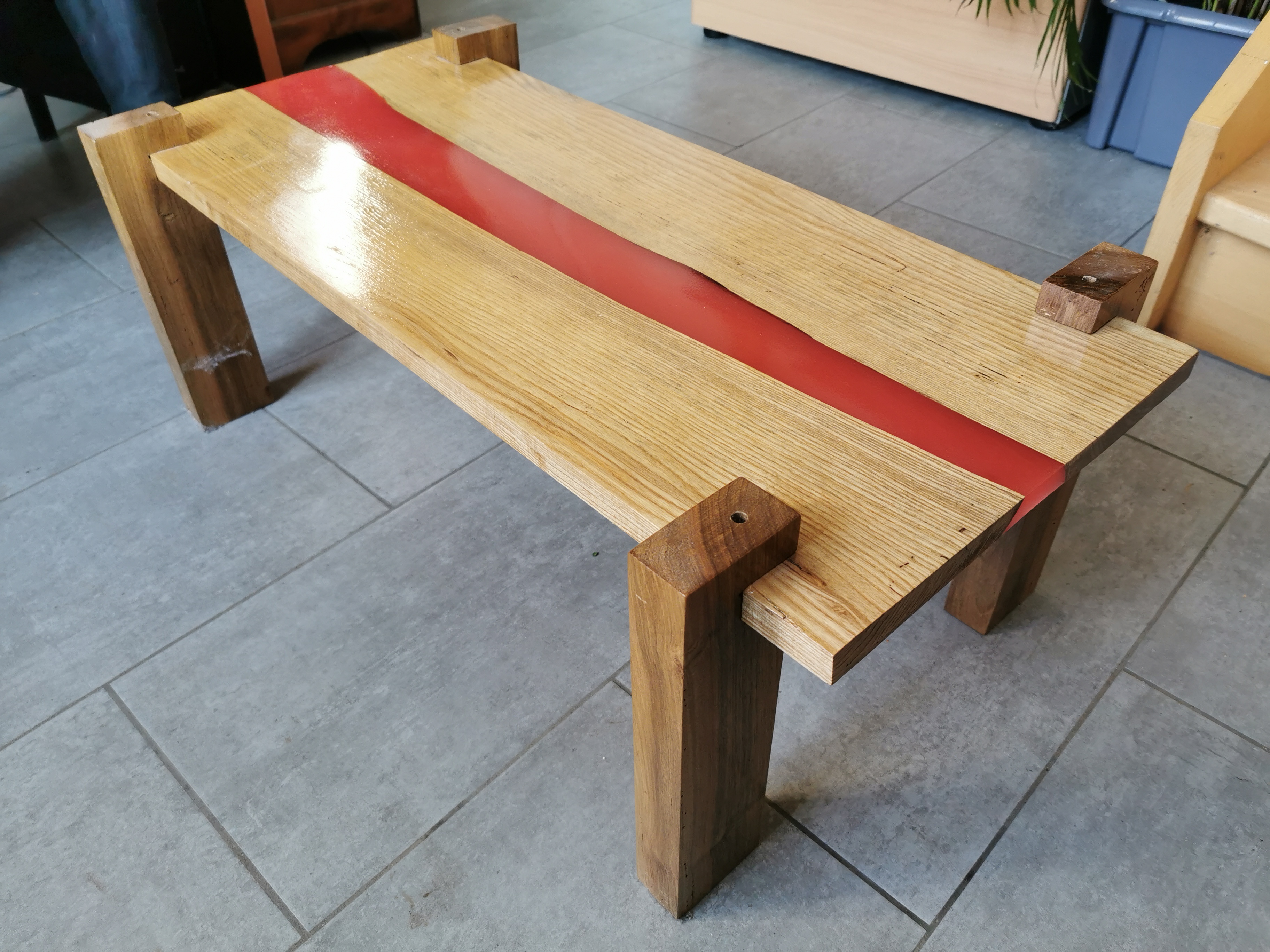 Petite photo un peu tardive de la table de salon que j'ai réalisé sans prétention. Ce coup d'essai m'a permis d'évaluer les difficultés que l'on pouvait rencontrer lors de ce type de réalisation. Pour ma part tout s'est bien passé, sauf des fuites de résine dues à une mauvaise étancheité.