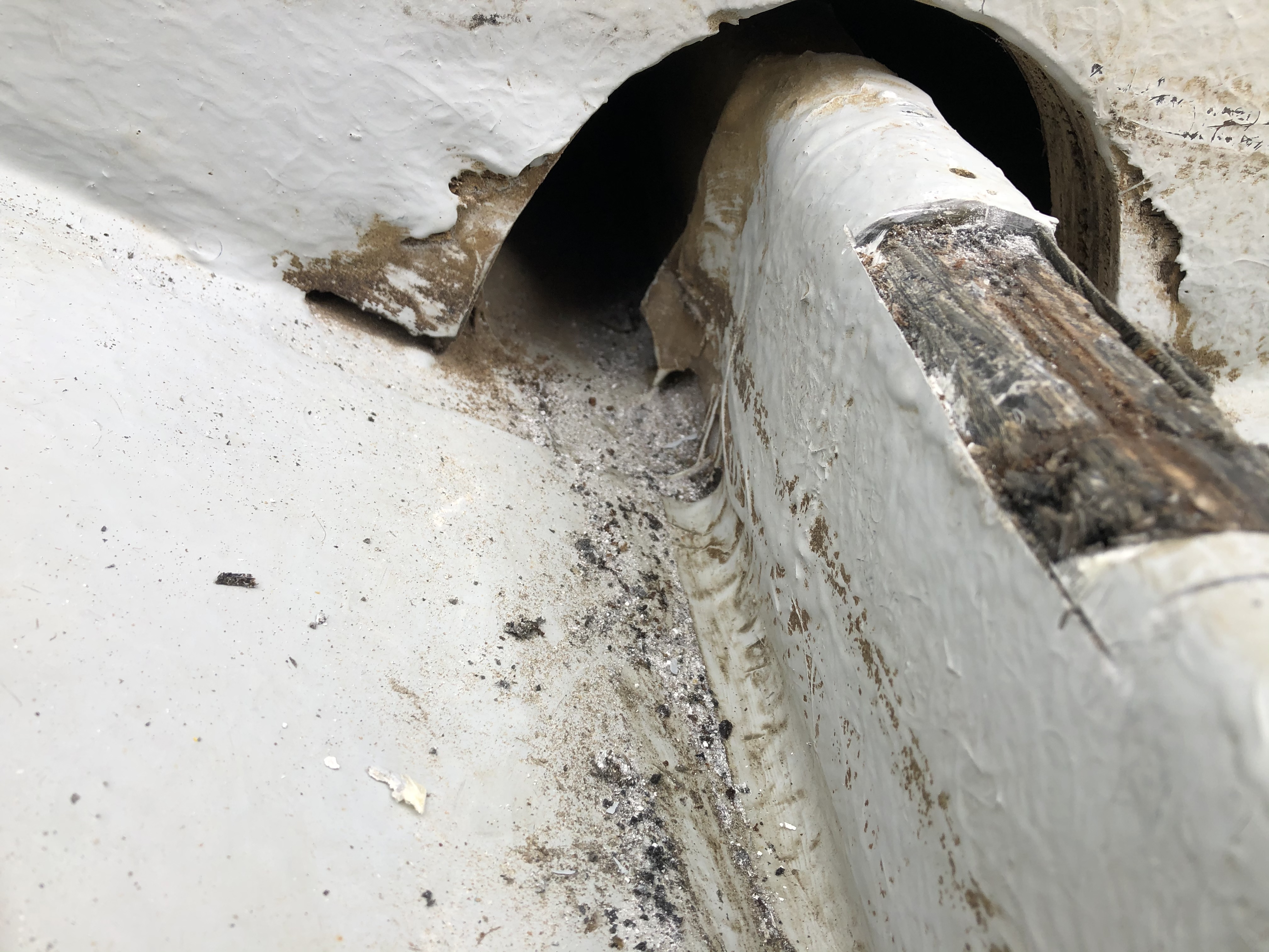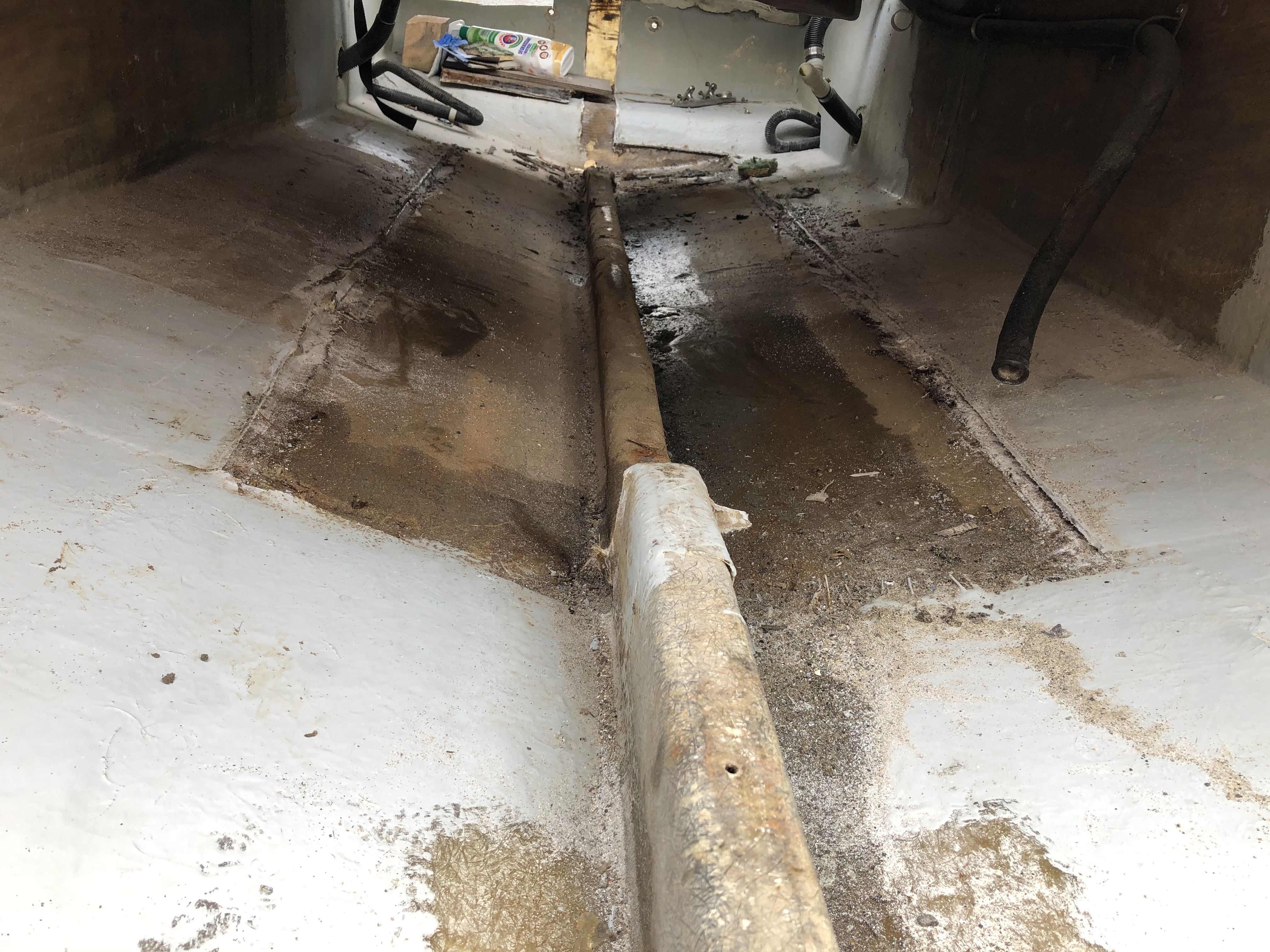 La première étape consiste à ôter tout ce qui est pourri et meuler tous les endroits où le stratifié est décollé, boursouflé, etc. puis faire un état complet des différents endroits à réparer.