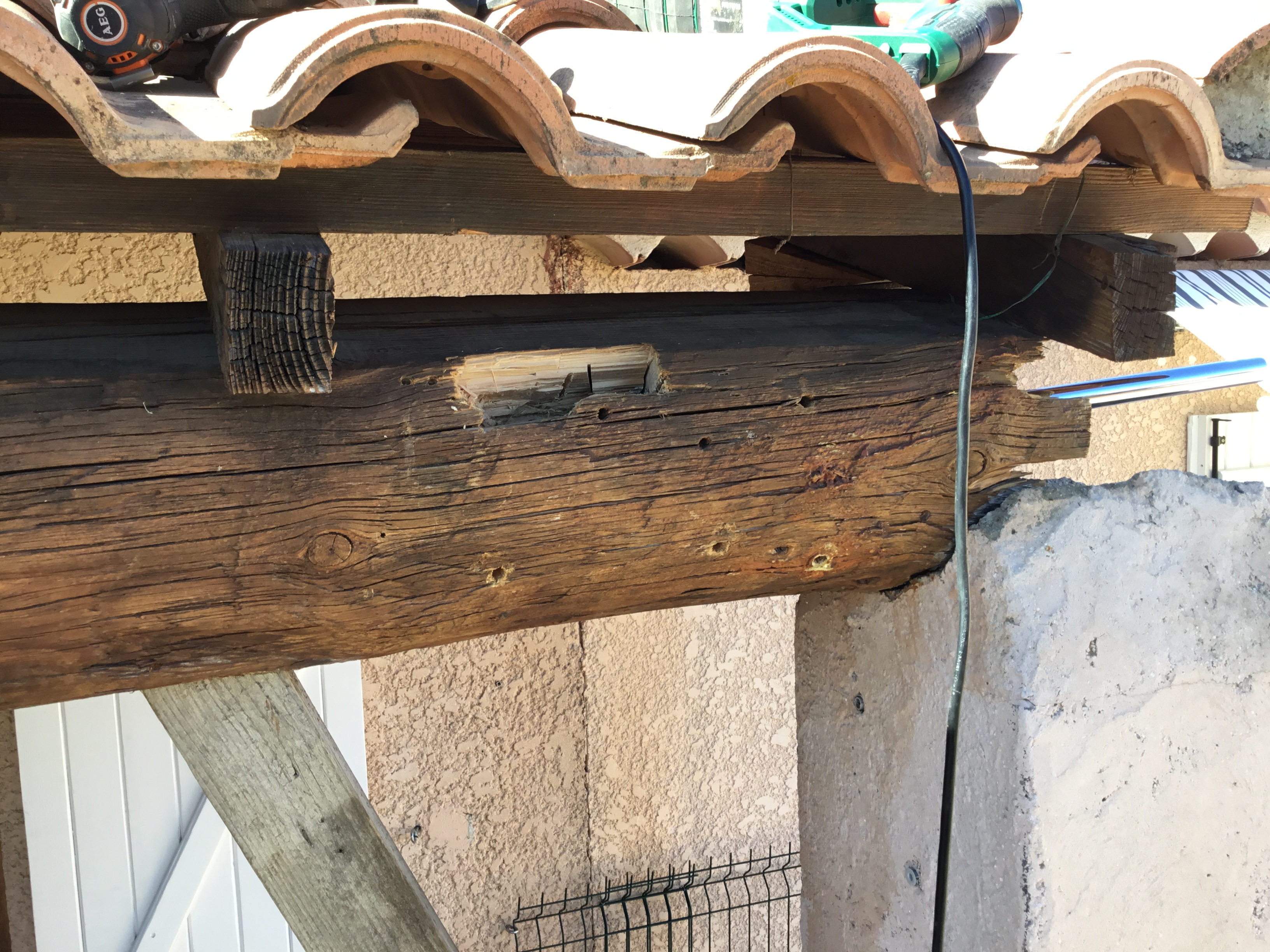 .....j’ai fait une jambe de force, et une saignée sur le haut de la poutre cf photo. Est il préférable de continuer la saignée jusqu’à l’entrée de la galerie pour y mettre du masticolle. Ou l’entaille ( 3 cm de haut ) )est elle suffisante pour y couler du 1060 ?