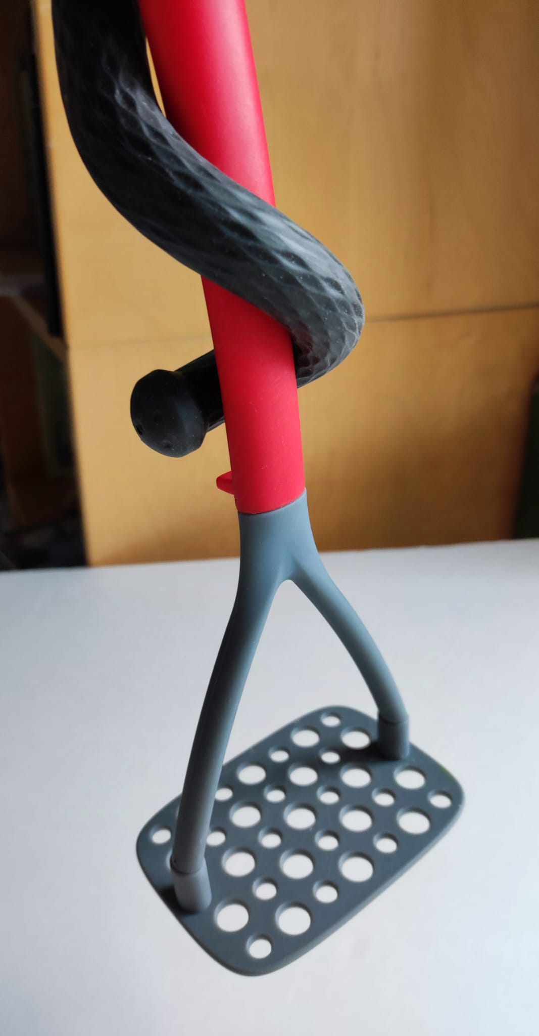 - la photo permet de voir comment je pense utiliser l'outil que je cherche à produire (pour le moment cette image a été réalisée avec le pied photo évoqué un peu plus haut) : un bras (en noir sur la photo) pouvant être utilisé sur des manches d'objets ménagers de n'importe quelle forme (en rouge sur la photo). les objets sont suffisamment solidaires pour être utilisés en cuisine.