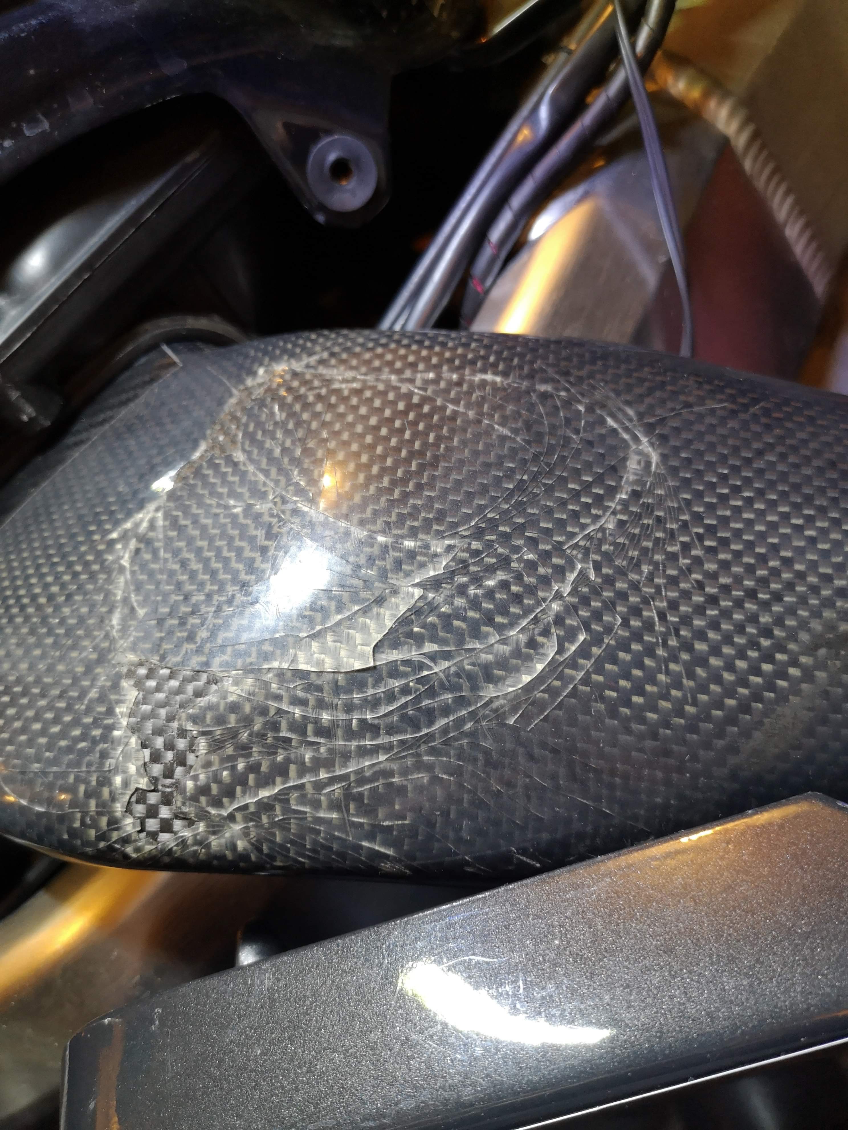 Du coup j'ai les pièces sous la main, elles sont en poly avec une couche carbone taffetas en finition + la protection qui a éclaté en plusieurs endroits lors d'impacts/chocs