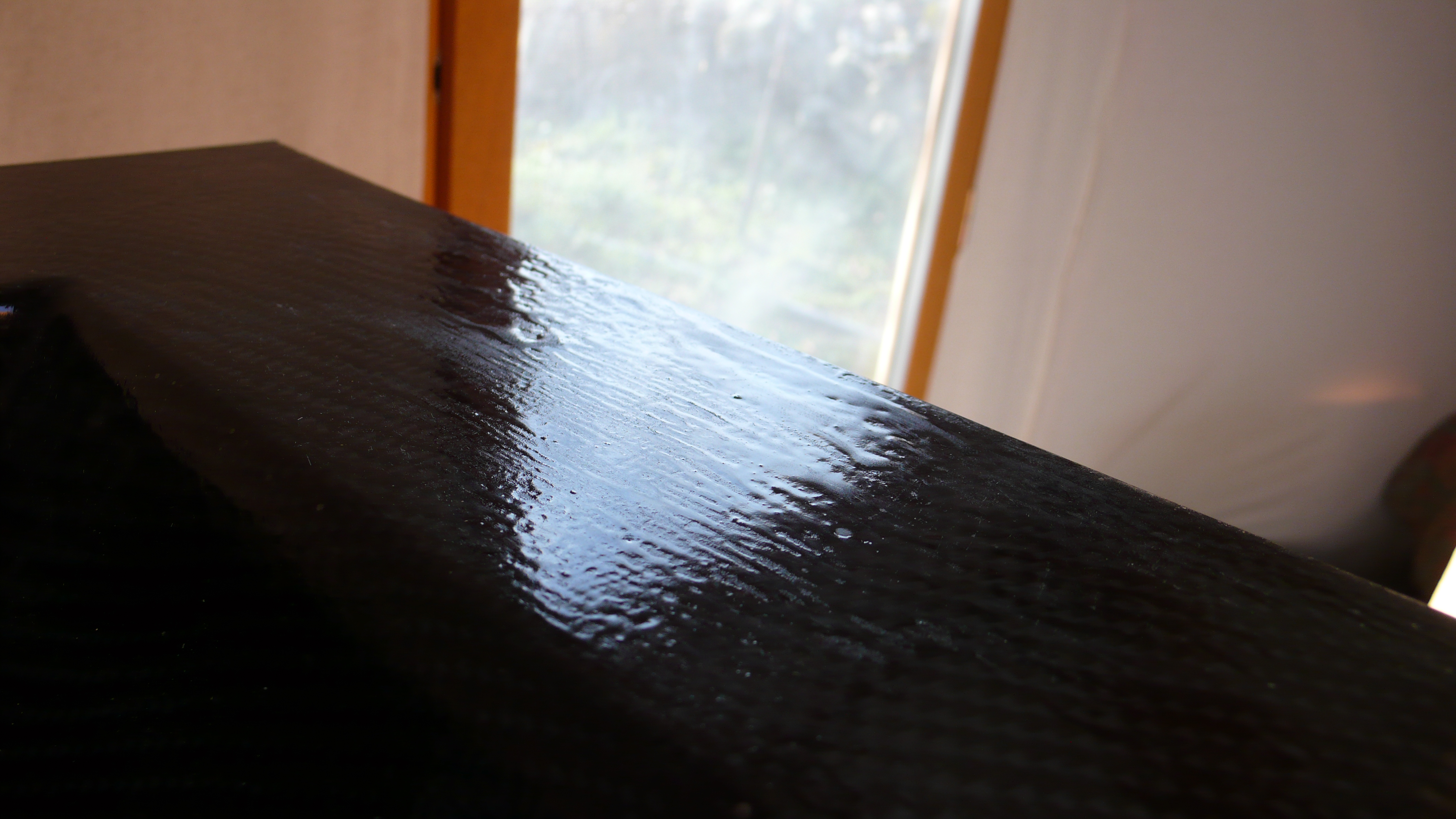 La couche sur la photos et fine je les bien tiré je pensai qu'il falai faire des couches fine pour faire un vernis fînal et pour ne pas avoir de coulure au niveau le l'arondis du lababo il faut peut etre un juste milieu entre trop et pas assez.