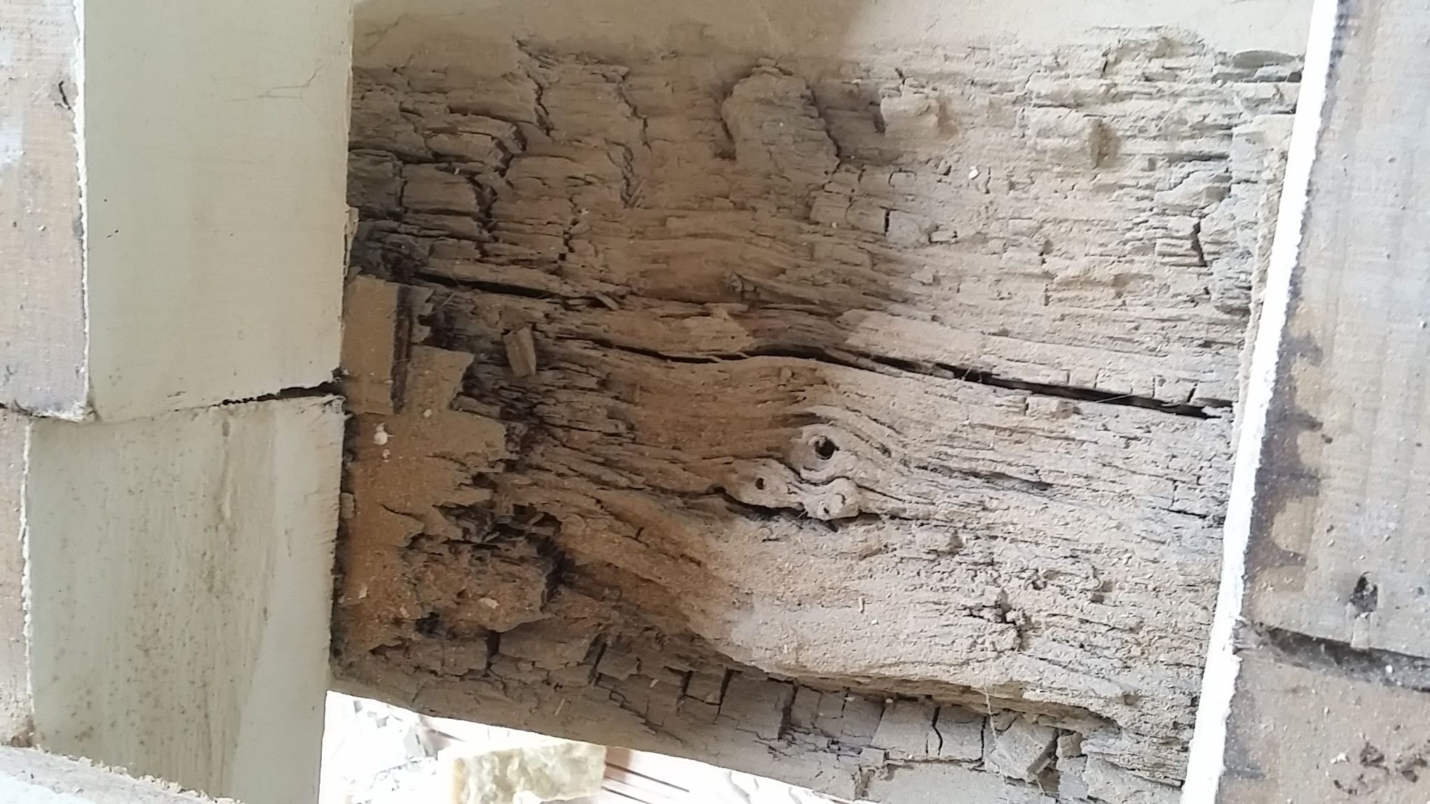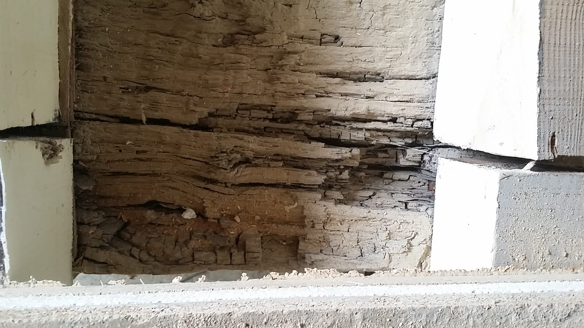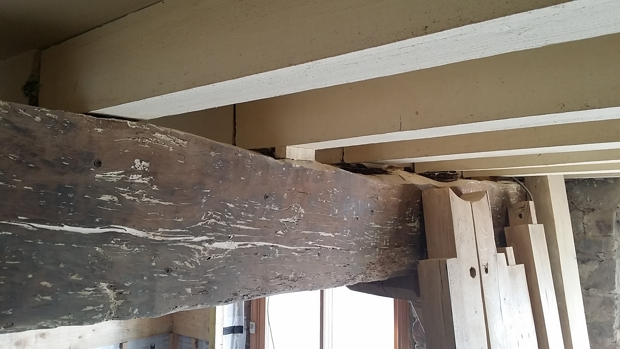 Comme dans beaucoup d'anciennes maisons, le bois porteur s'étant dégradé au fil des années, des cales ont été positionnées sous les solives pour maintenir leur niveau, de manière très irrégulière d'ailleurs.