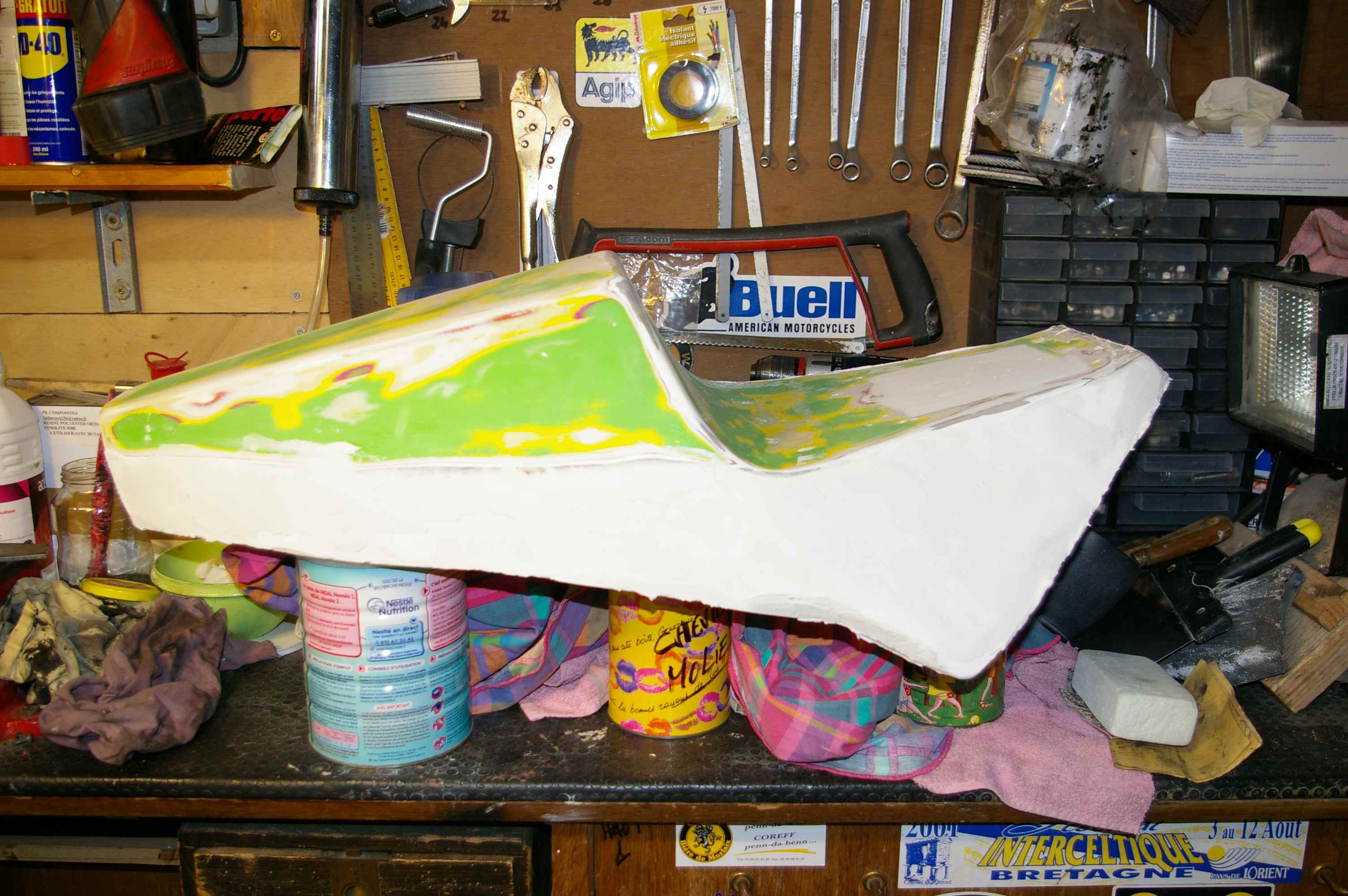 Sur la moto: la coque dessus d'origine (en poly ) et forme avec le carton avant la mousse polyréthane.