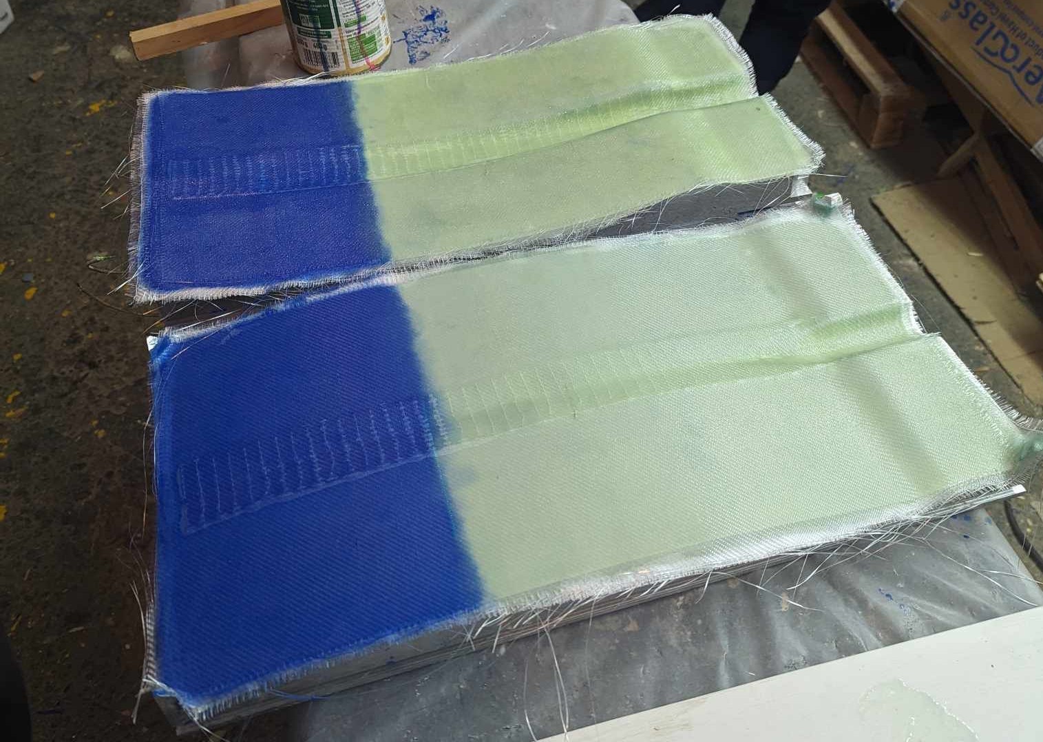 Nous utilisons de la résine Époxy et de la fibre de verre en sergé 165gr/M2, de l'UD 300gr en largeur 5cm et une mousse PU bi composants.