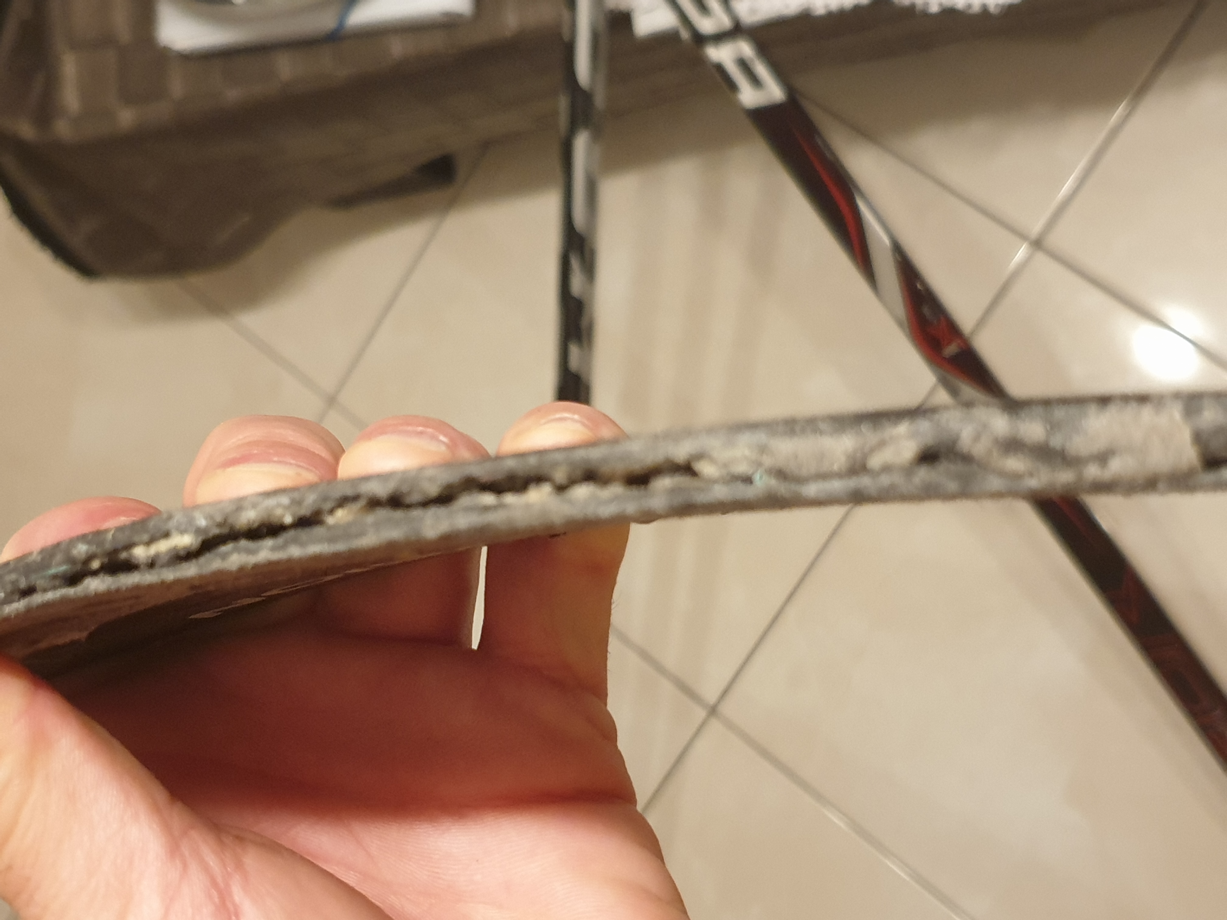 - Le dernier type de cassure, c'est le bout de la palette qui est normalement arrondi et qui casse sur un coup, sous un patin, dans un joueur ou dans la ballustrade. Du coup cela fait un accroc qui n'est as règlementaire pour jouer en compétition.