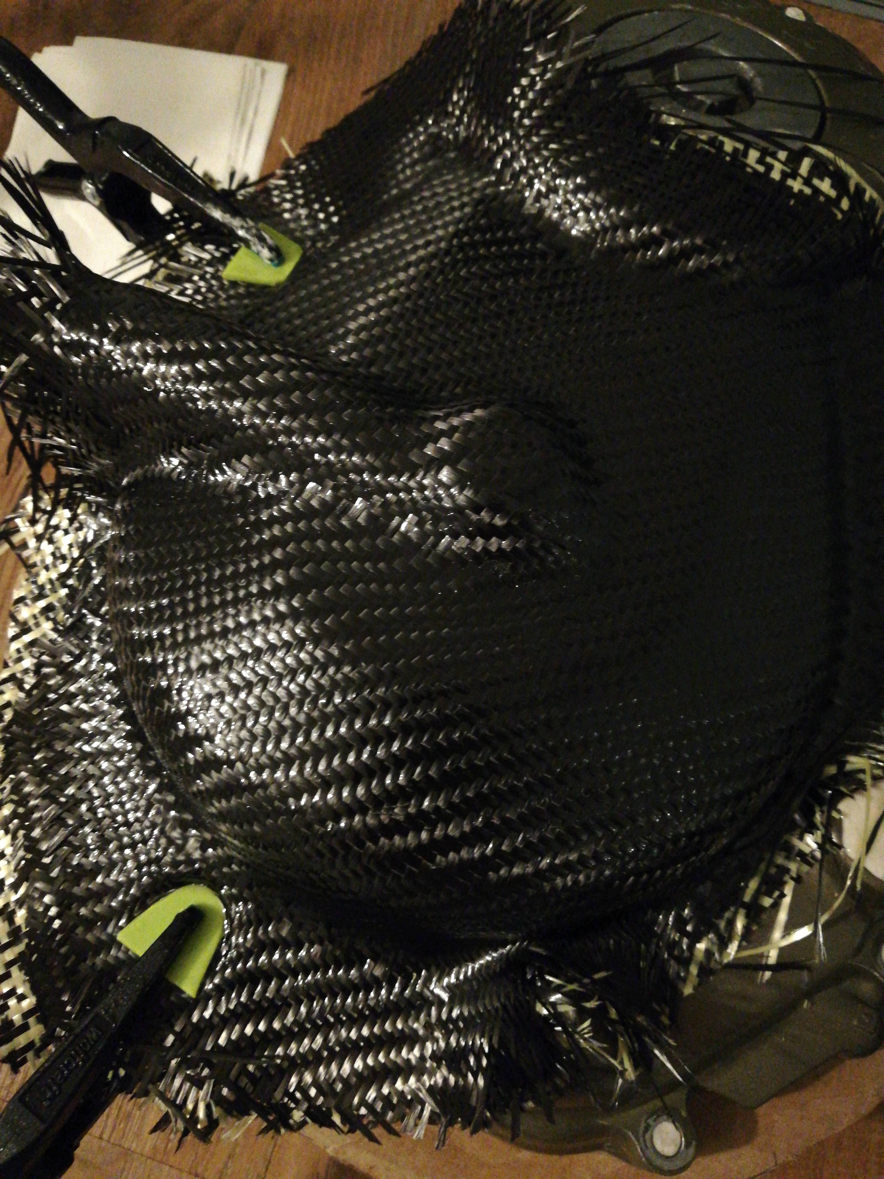 Les bords sont bien plaqués, le tissu est bien débuller (enfin j'espère) et surtout je vais laissé sécher et demain j'attaque la silionne et le carbone après avoir poncer au 120 et dégraisser à l'alcool à brûler :D