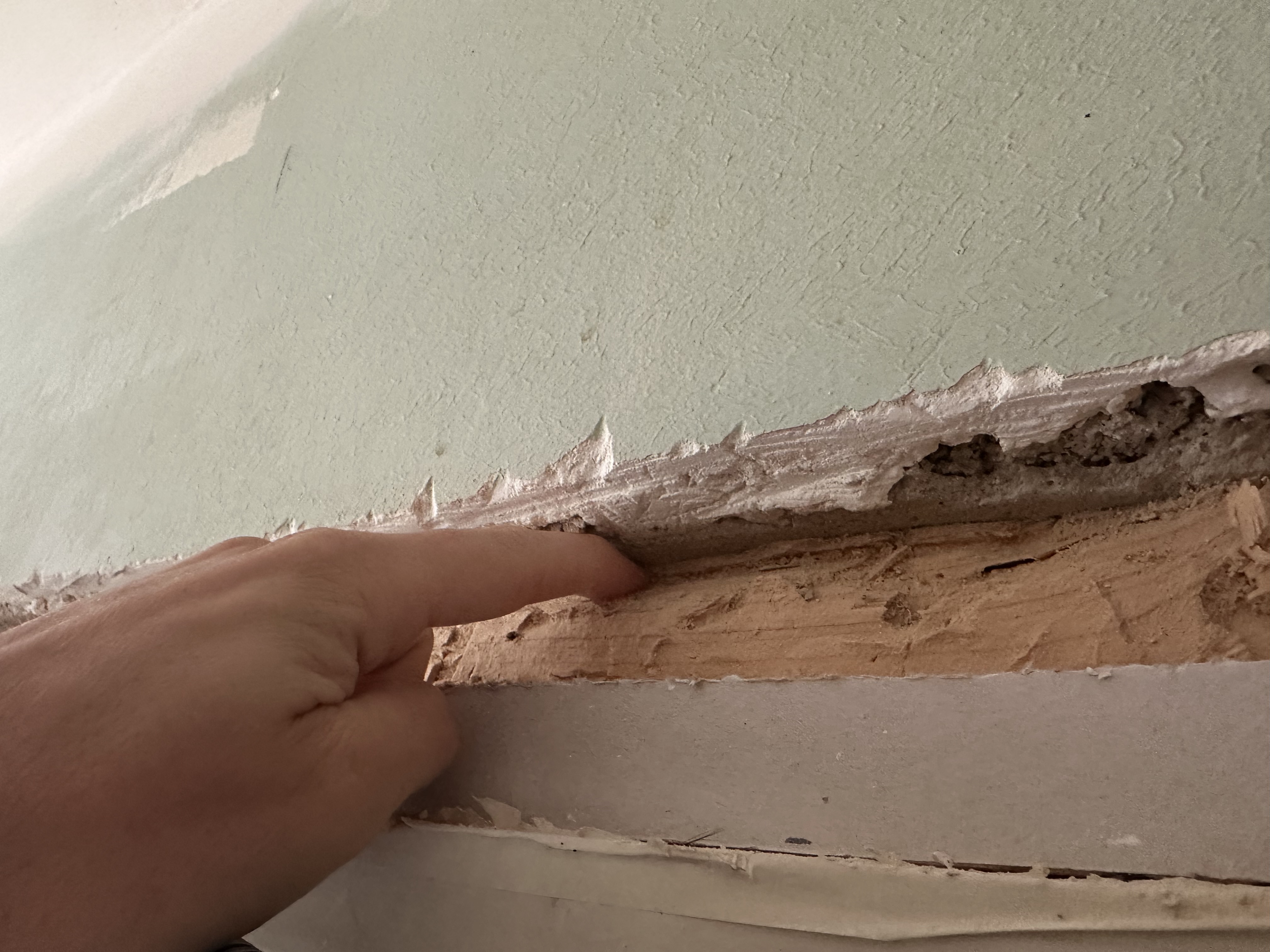 J’ai gratté les parties attaquées pour avoir un aperçu des dégâts, vu la largeur du linteau l’installation n’a pas besoin d’être changé. Mais par acquis de conscience je voudrai consolider - durcir les galeries à l’intérieur non atteignable.