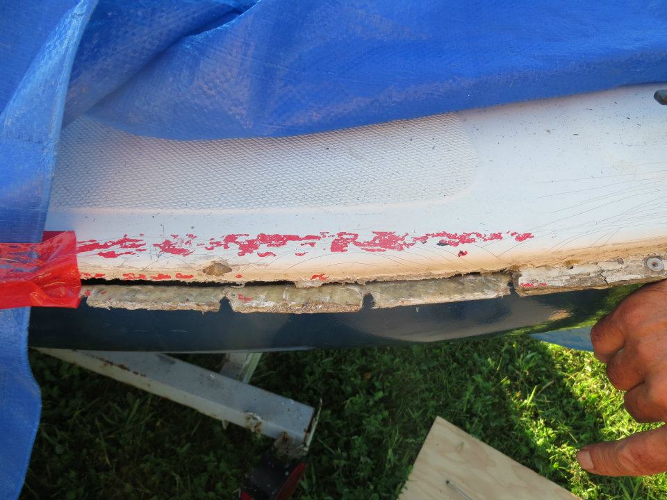 Il s'agit de la liaison entre la coque et le pont. Le bateau a été mal amarré pendant une tempête et certaines parties de la strate ont été arrachées (voir photos).