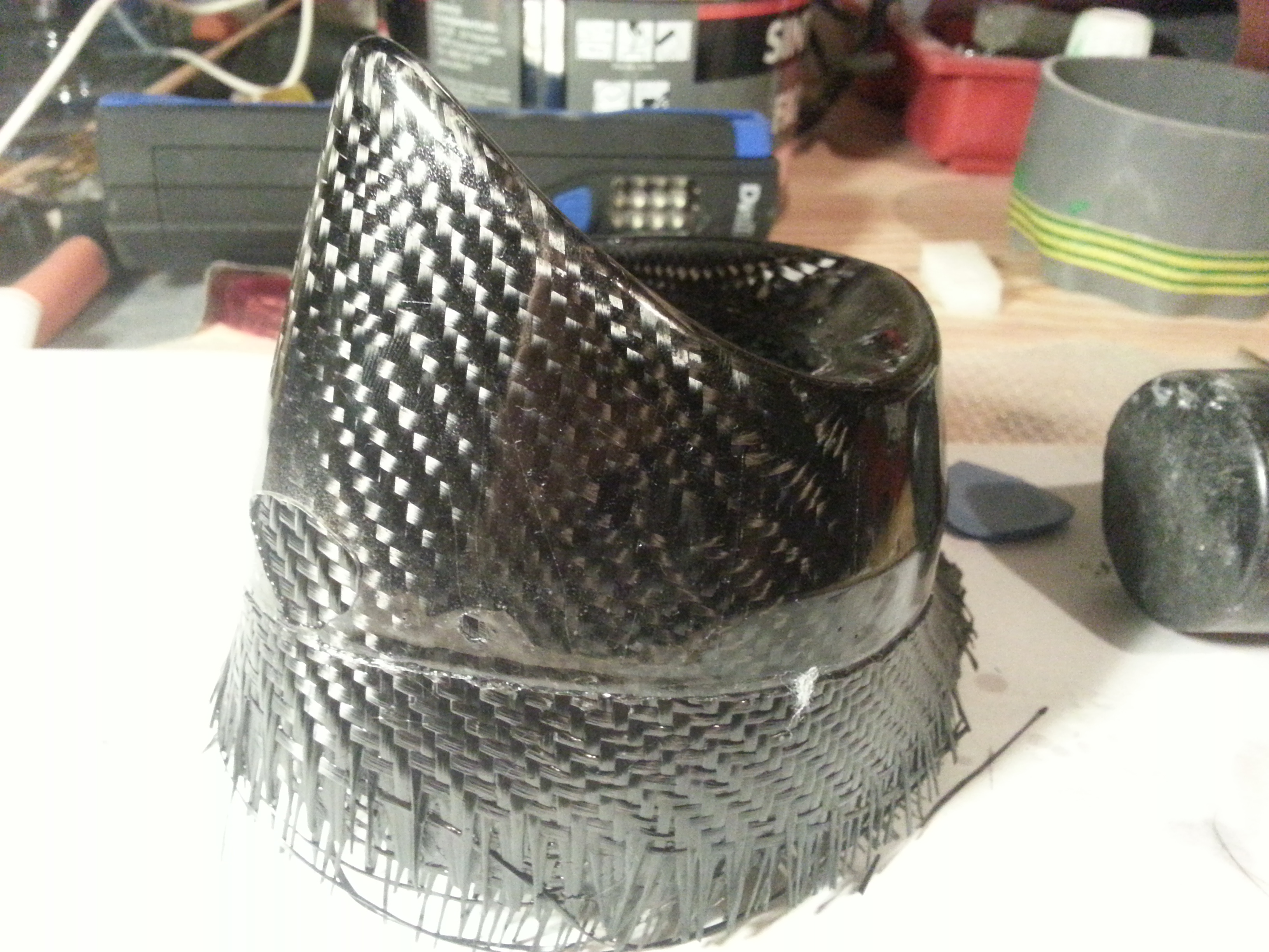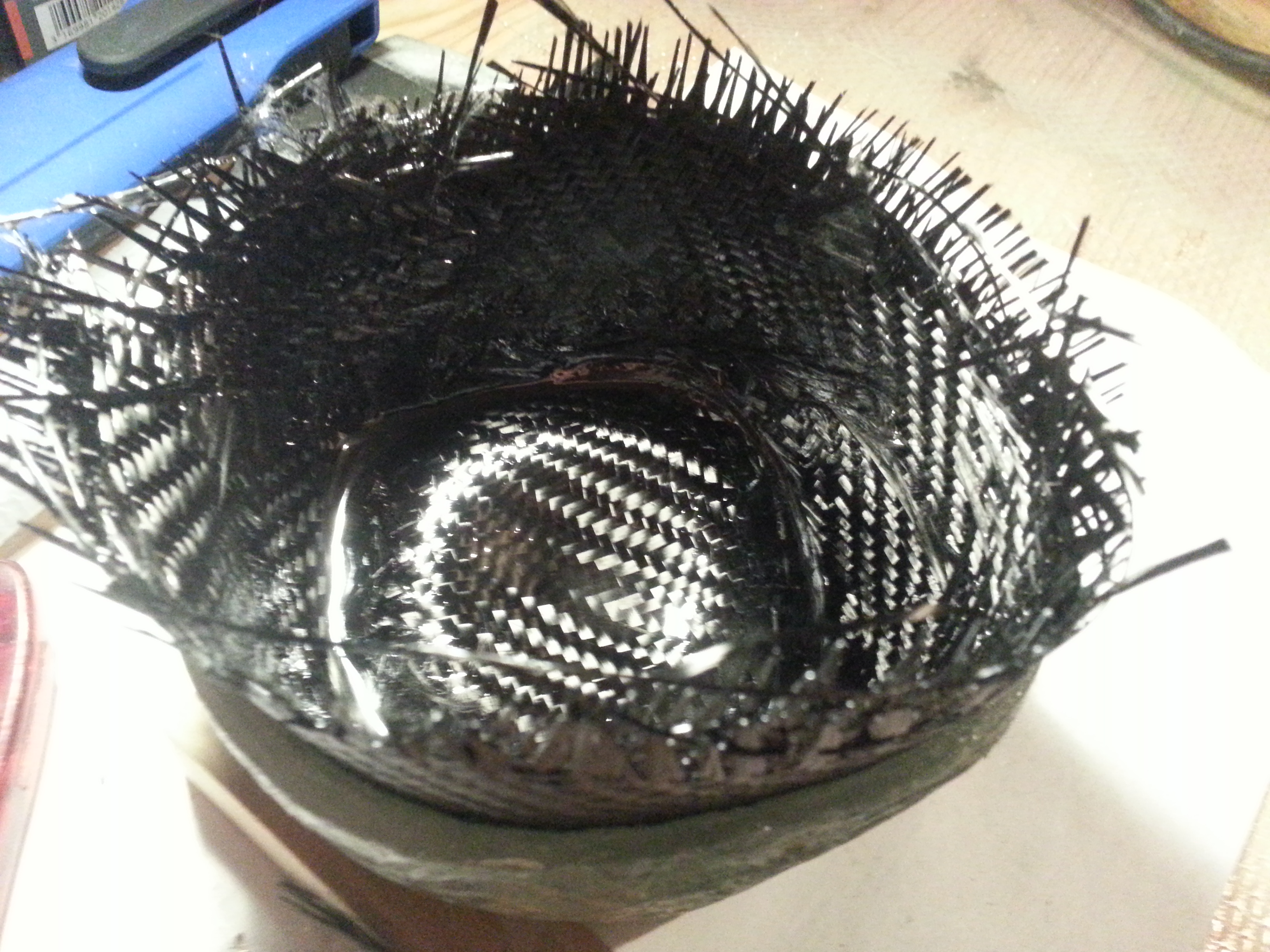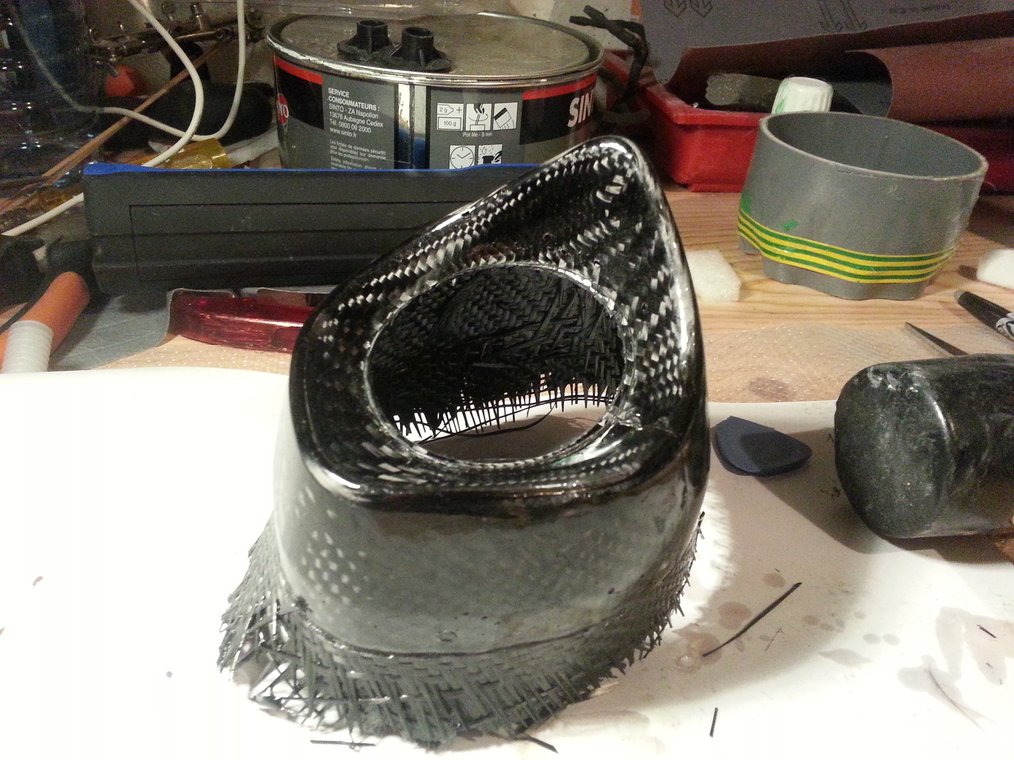 Je me suis dit que si je retournais la pièce, en fin de stratification, le surplus de résine s'écoulerai vers la partie "en surplus" de ma pièce ... mais j'ai peur que le carbone "glisse" avec, du fait de la gravité.