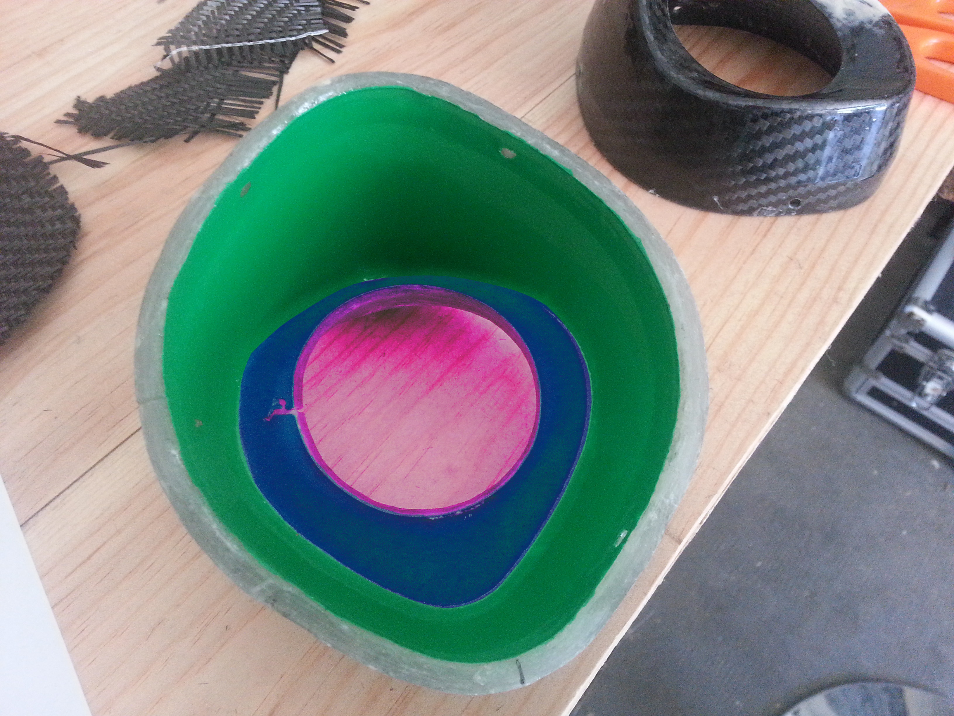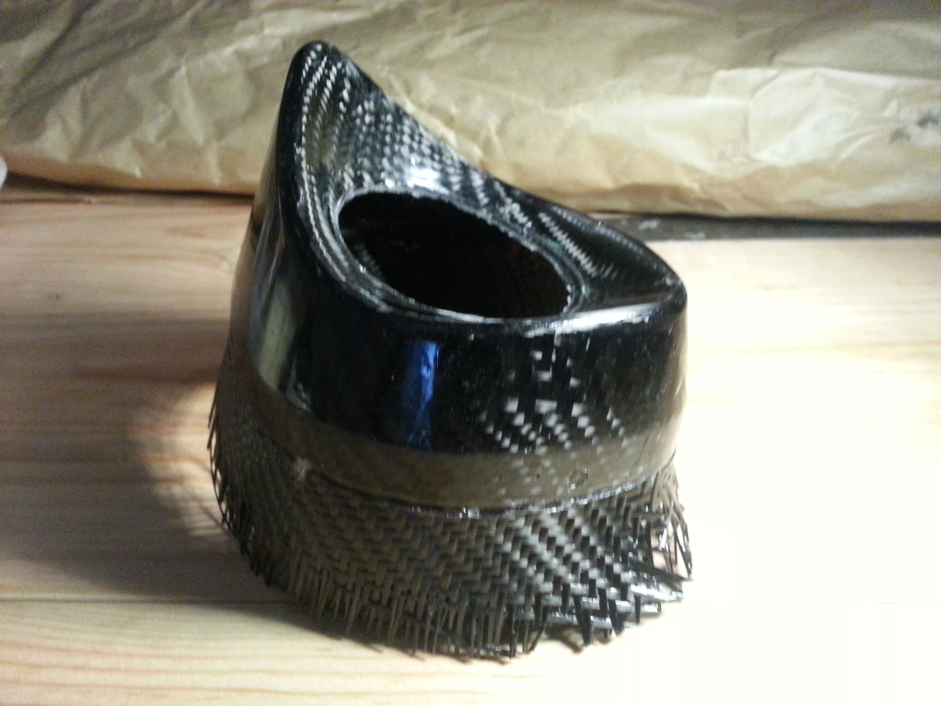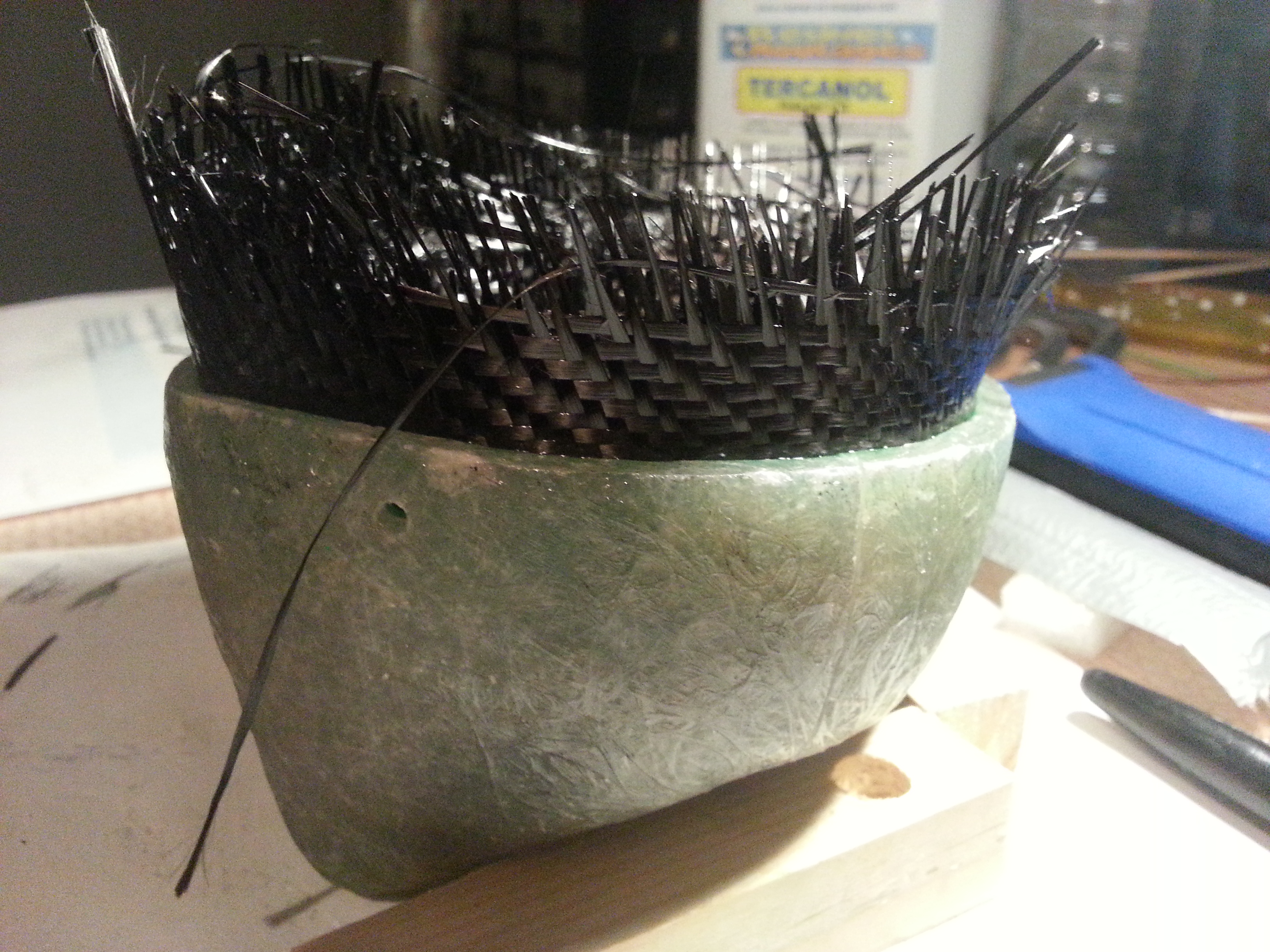 Je me suis dit que si je retournais la pièce, en fin de stratification, le surplus de résine s'écoulerai vers la partie "en surplus" de ma pièce ... mais j'ai peur que le carbone "glisse" avec, du fait de la gravité.