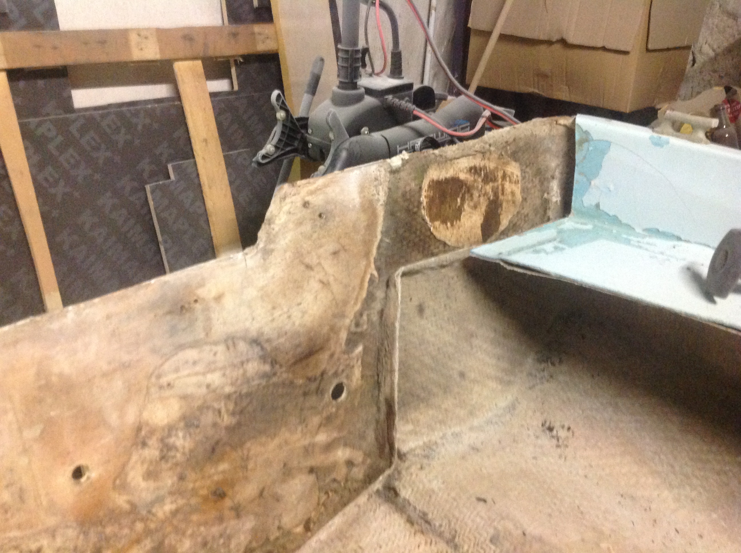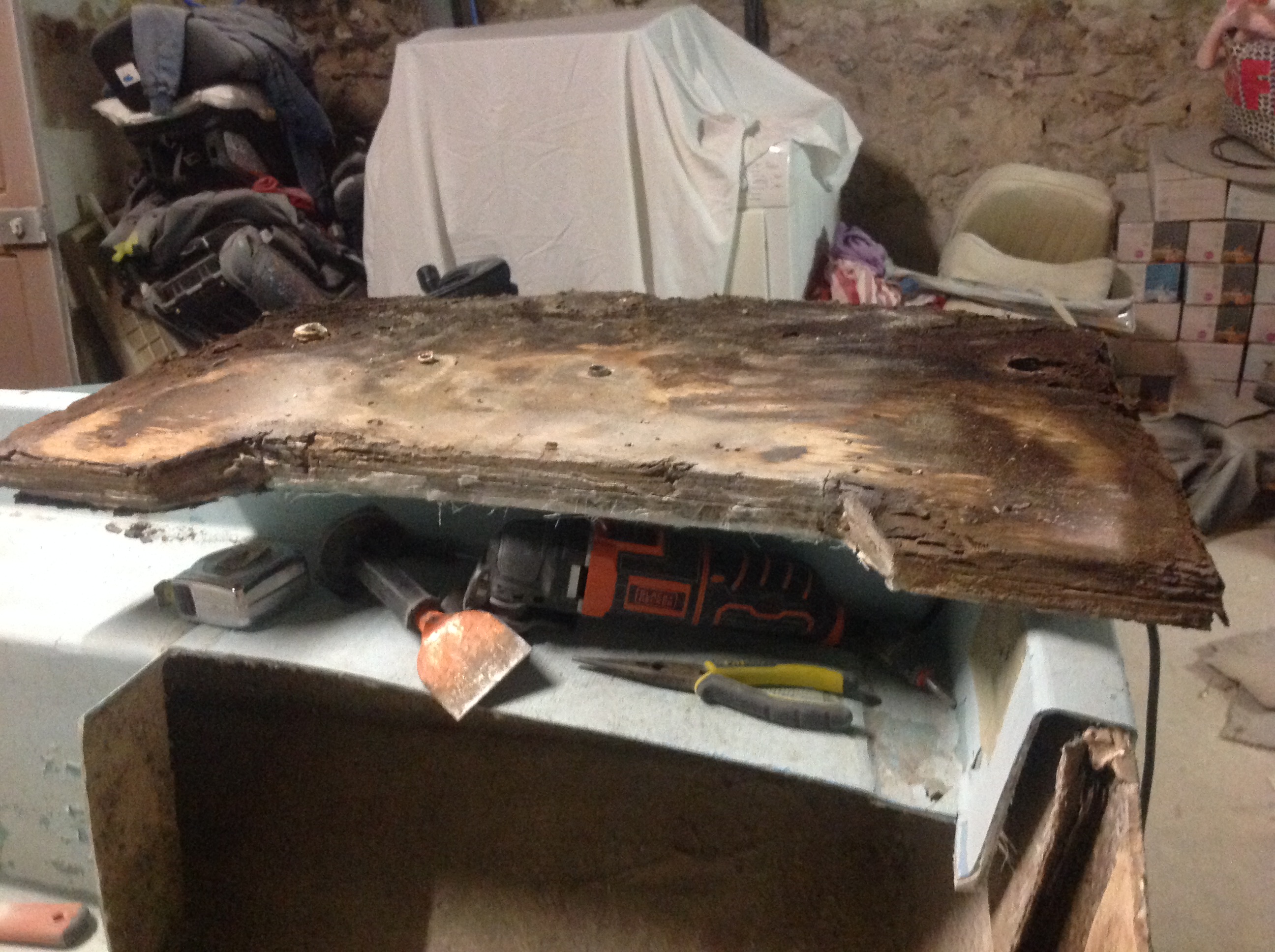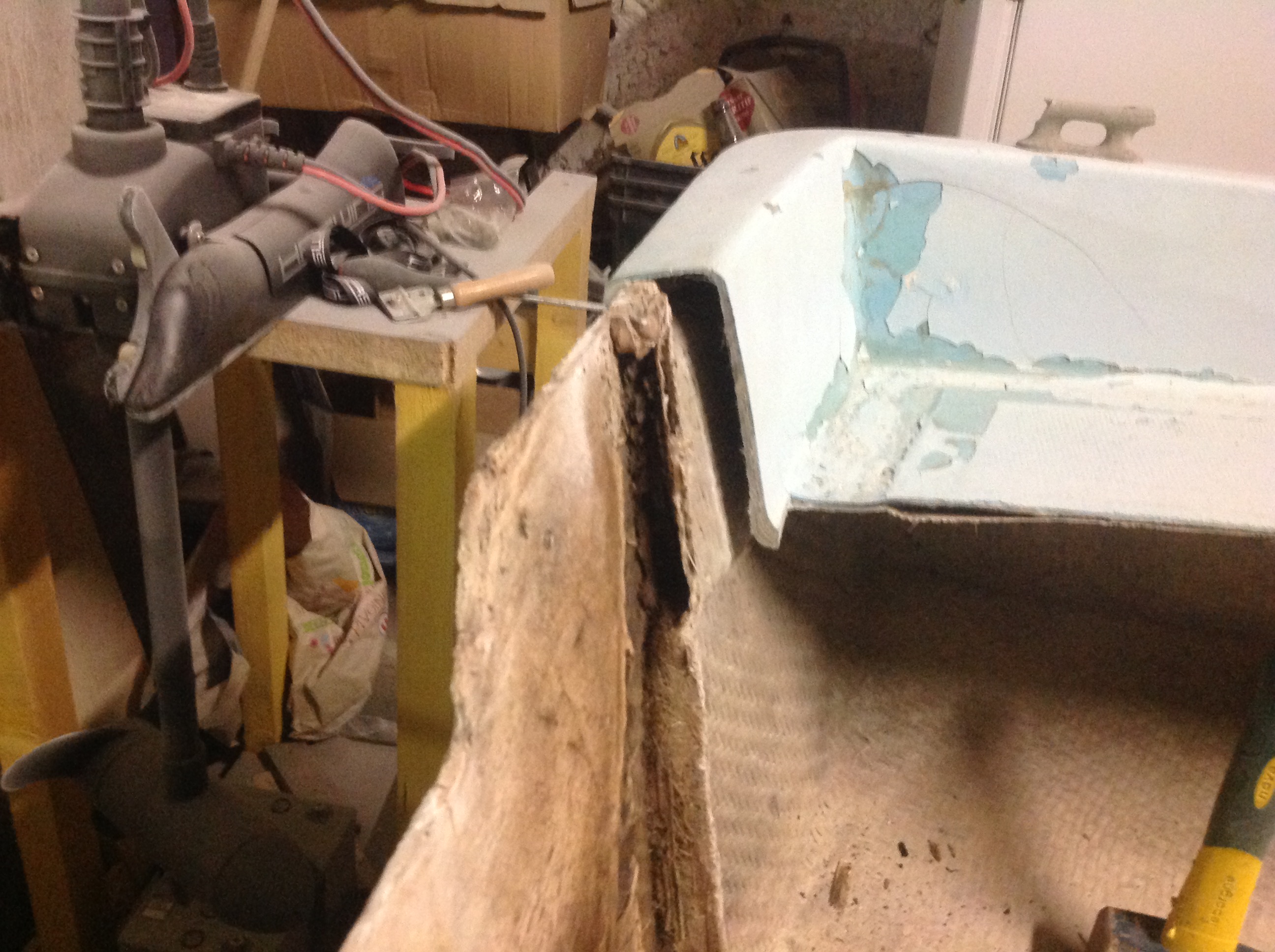 Bonjour donc j ai découpé le tableau arrière le cp était collé avec de la colle ou mastic blanc très dur et il y avais 2 morceaux de cuivre pris dans le bois et qui sortaient a l extérieur ensuite il y a deux morceaux de cp en haut qui continue jusqu'au bord de la coque ce bateau n a pas fini de m étonné