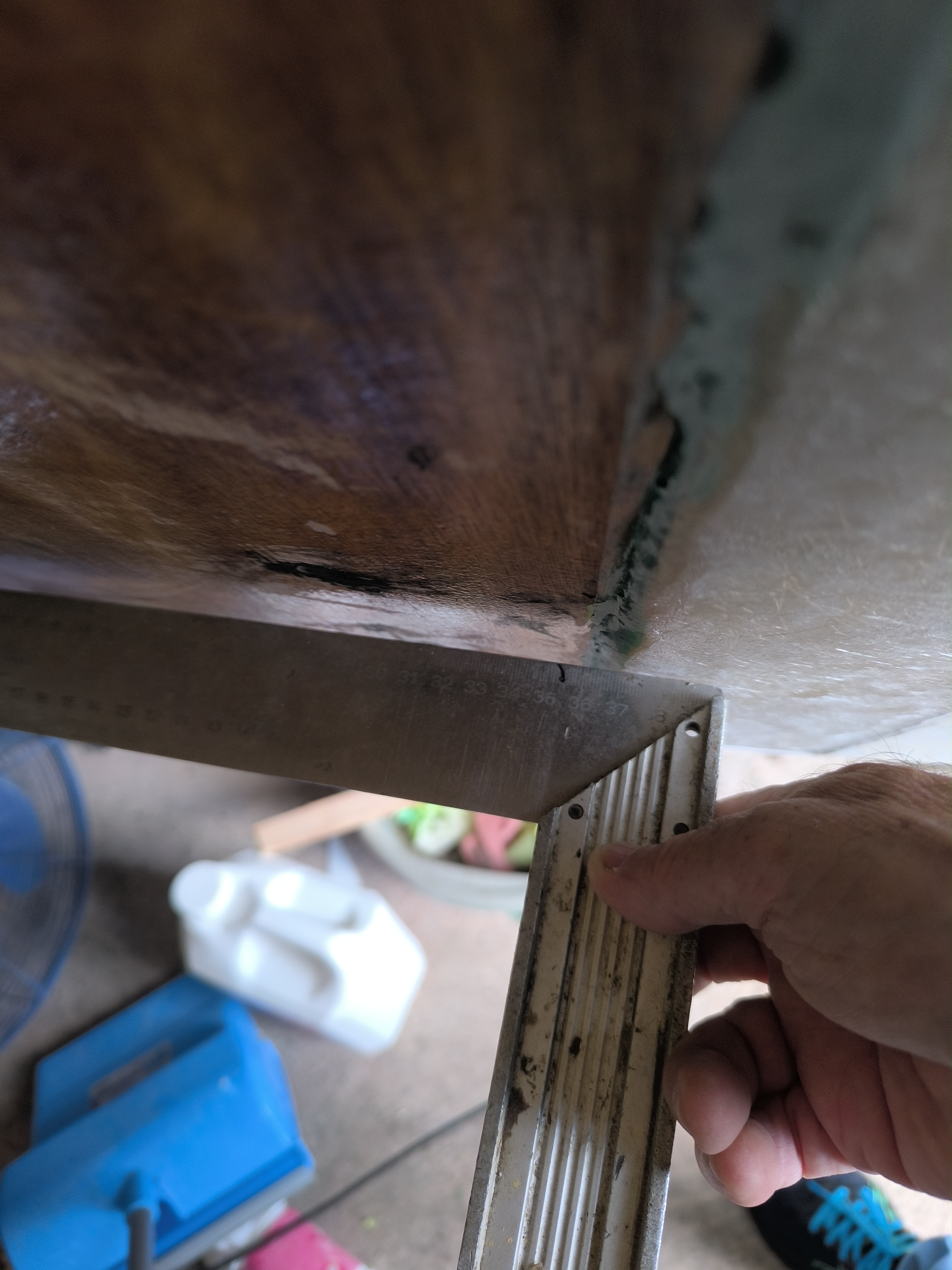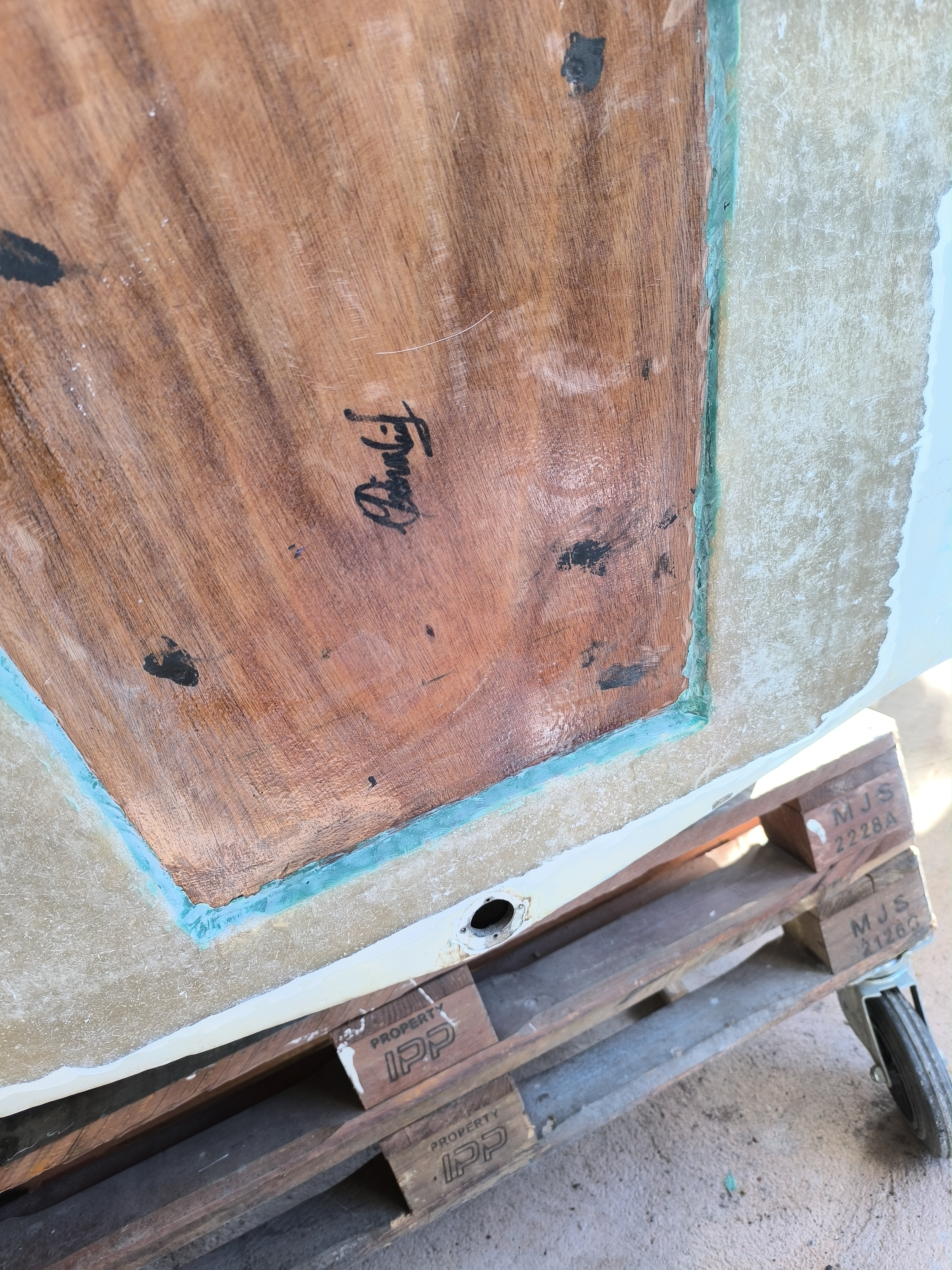 Une question je dois stratifié le tableau arrière qui va supporter un 30cv pas plus , comme l'autre mat roving mat mais là le bois effleure en haut la fibre mis a nu mais en bas il y a au moins 6mm ,7mm a rattraper, j'ai mis du mastic fibré pour un joint en pente douce pour debuller facilement mais mon idée est de rajouter une épaisseur de 450 au gabarit du bois pour rattraper la différence ; interposé entre la pose du mat et du roving qui iront s'accrocher elles sur la fibre mis à nu que d'ailleurs que je vais agrandir car là il n'y a que 10 cms (photos)