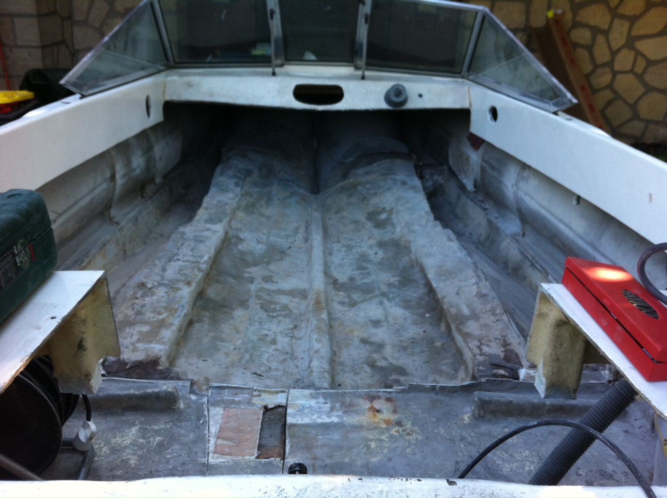 Après avoir retirer le pont je voudrai renforcer le fond du bateau avant de couler la mousse PU, une couche de mat 300 suffira t'elle ? Voir photo du pont retiré ci-dessous .