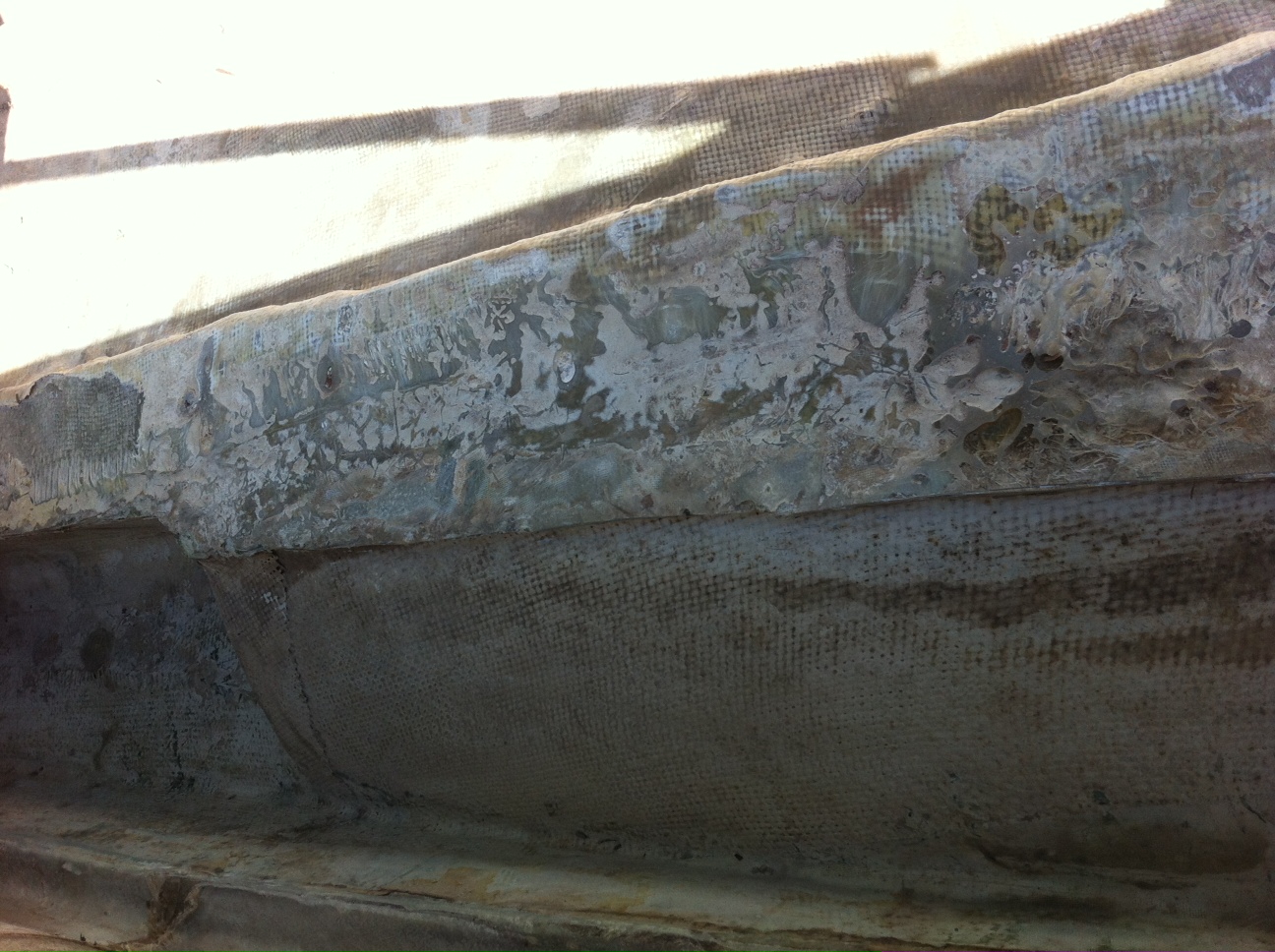 La coque est d'origine juste la double coque qui a été repris au vu des bulles, sur la photo ci-dessous en bas le fond le la coque en bonne état sans bulle et en haut ou la double coque(bullé) vient se greffer. La double coque est juste sur la partie centrale du bateau, elle ne va pas jusqu'au bord du bateau