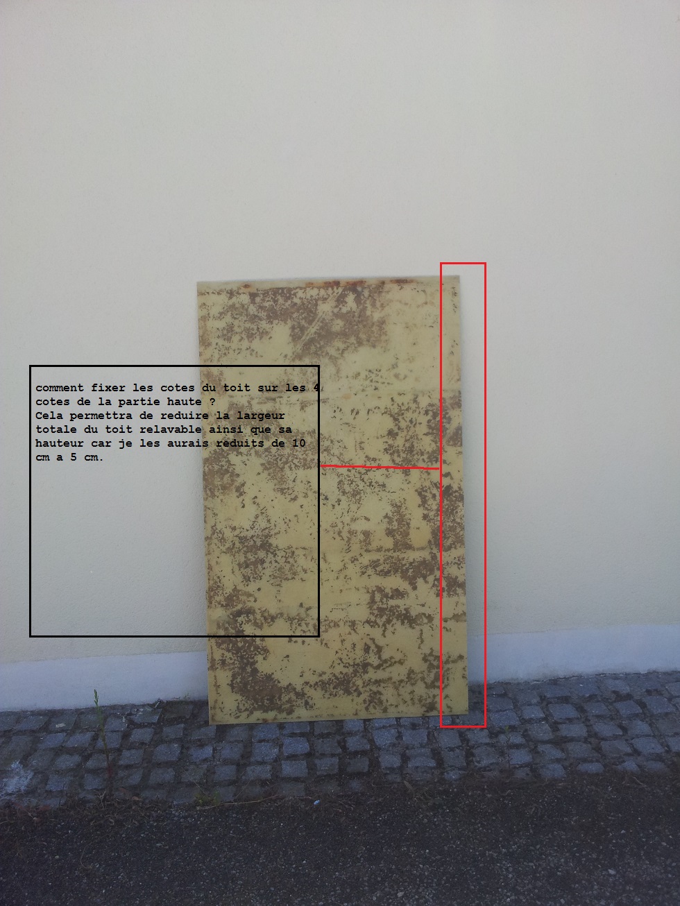 4/ reduire la largeur du toit pour qu il soit vraiment au dessus de mon fourgon et qu il ne deborde pas sur les cotes comme sur la photo jointe.