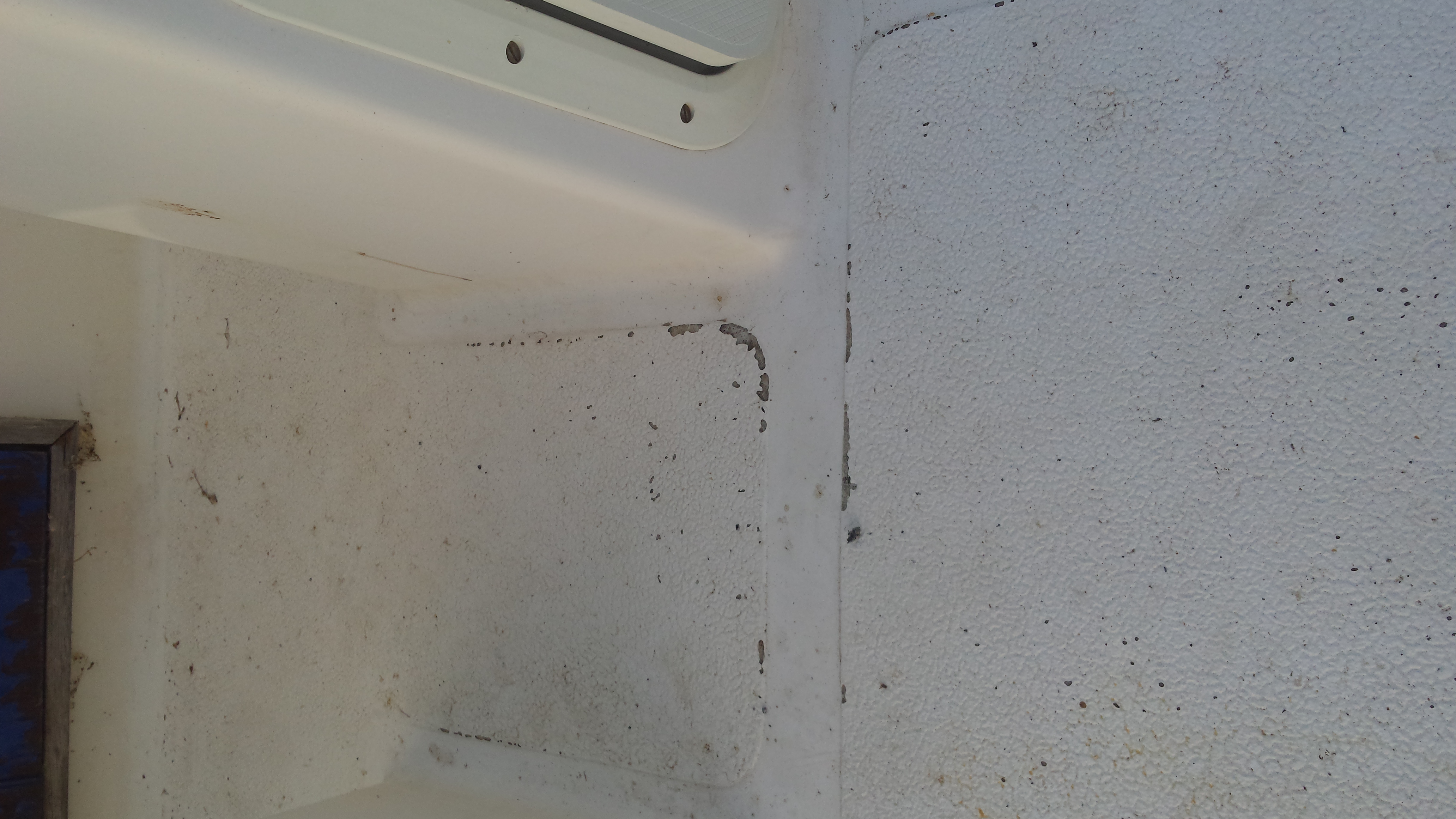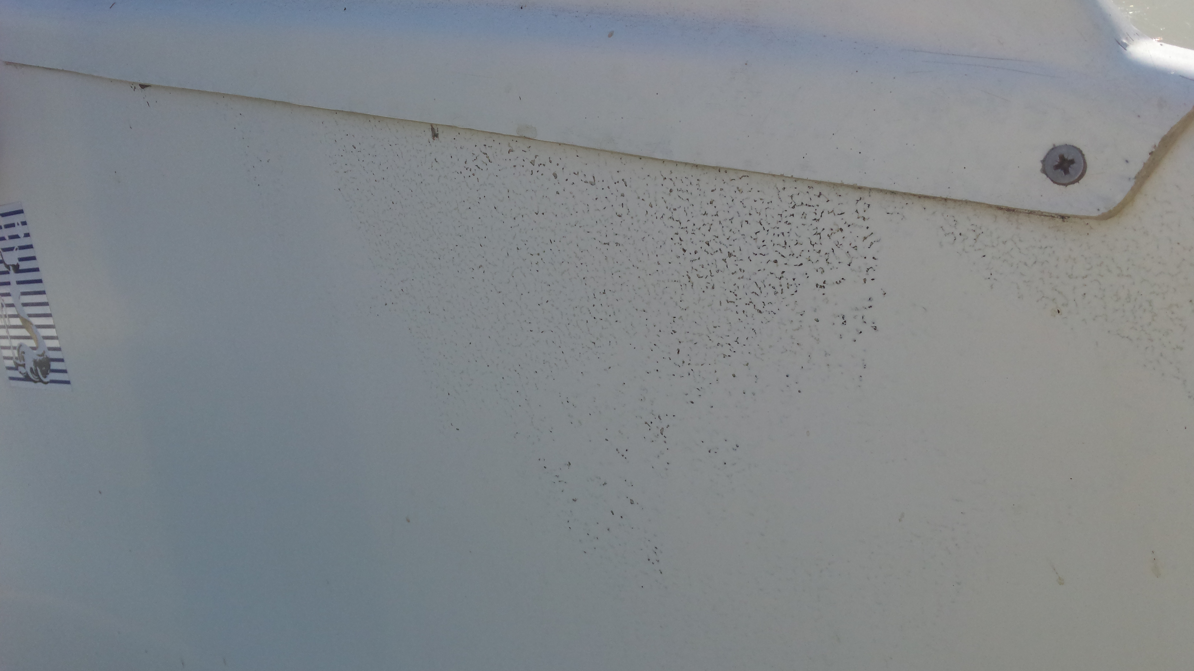 Je suppose que le précédent propriétaire a poncé le gel-coat et qu'il a peint sauf que c'est raté et ça s'écaille… ou alors il a repris au top-coat comme pourrait l'indiquer la deuxième photo avec ce cet effet peau d'orange moche.